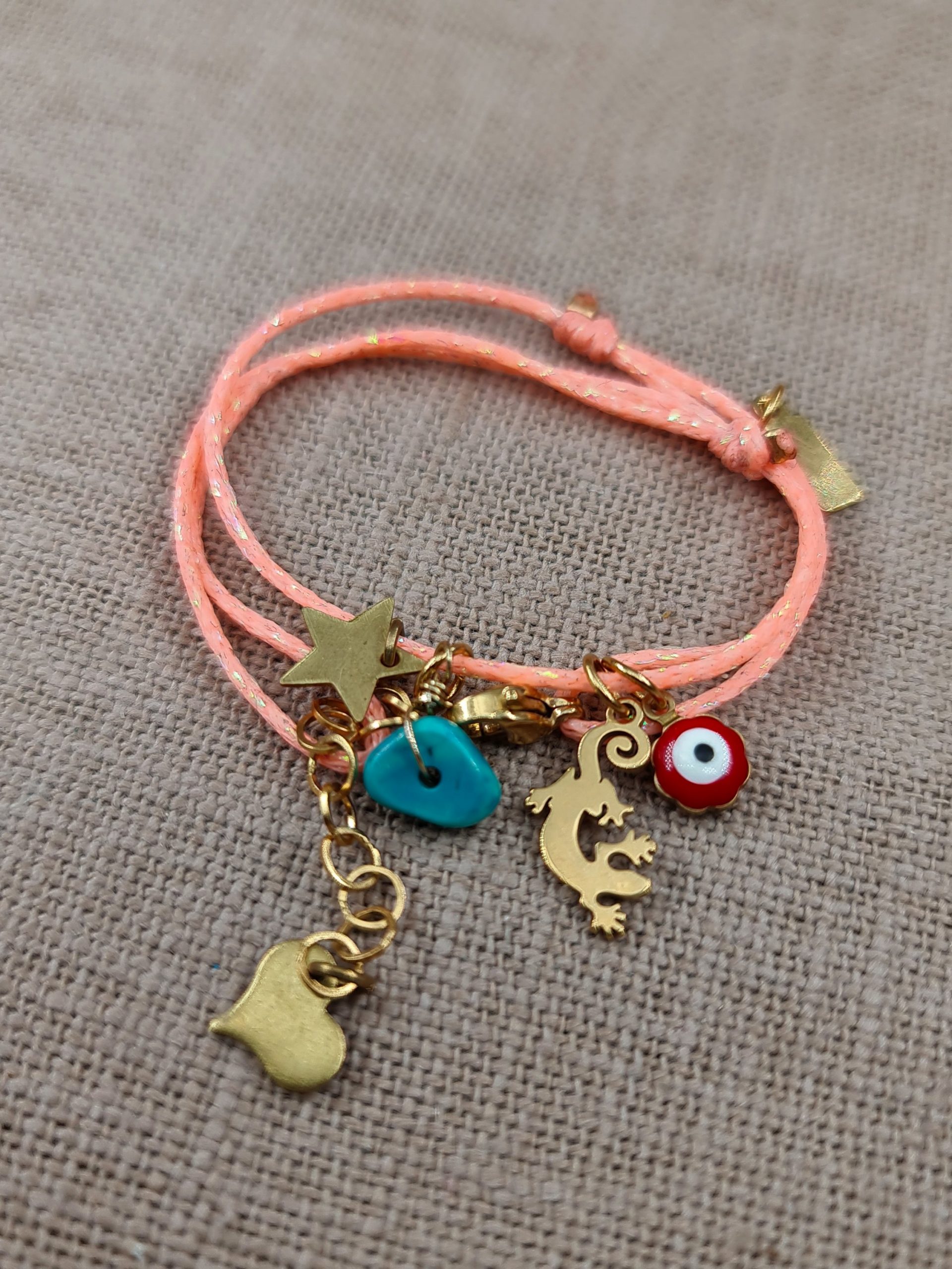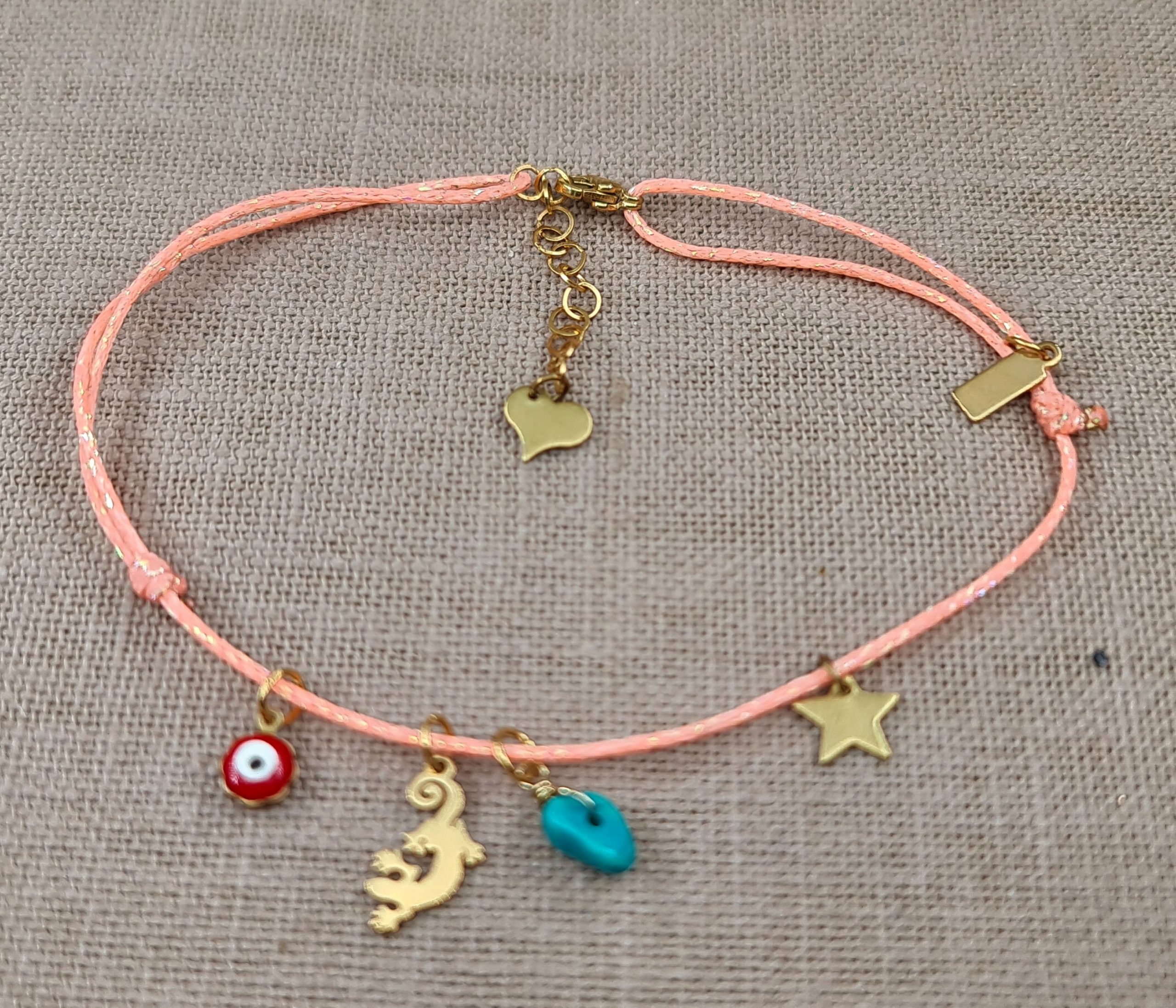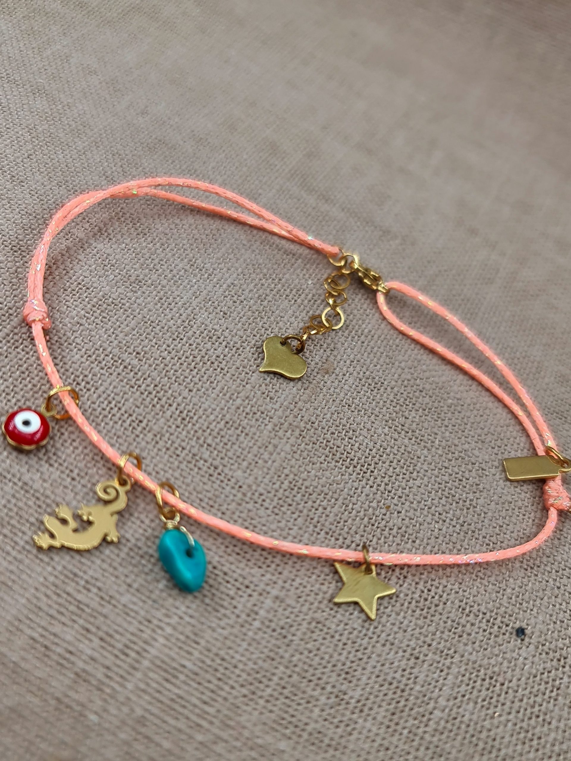 Bracelet cheville « Gri-gri » un modèle 3 options. Cheville/bracelet/collier. Résistant à l’eau. Fermeture réglable. Couleur cordon saumon fluo.