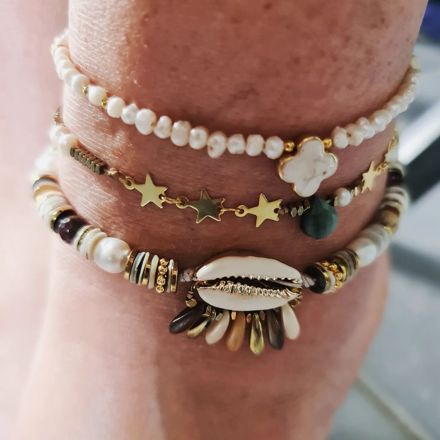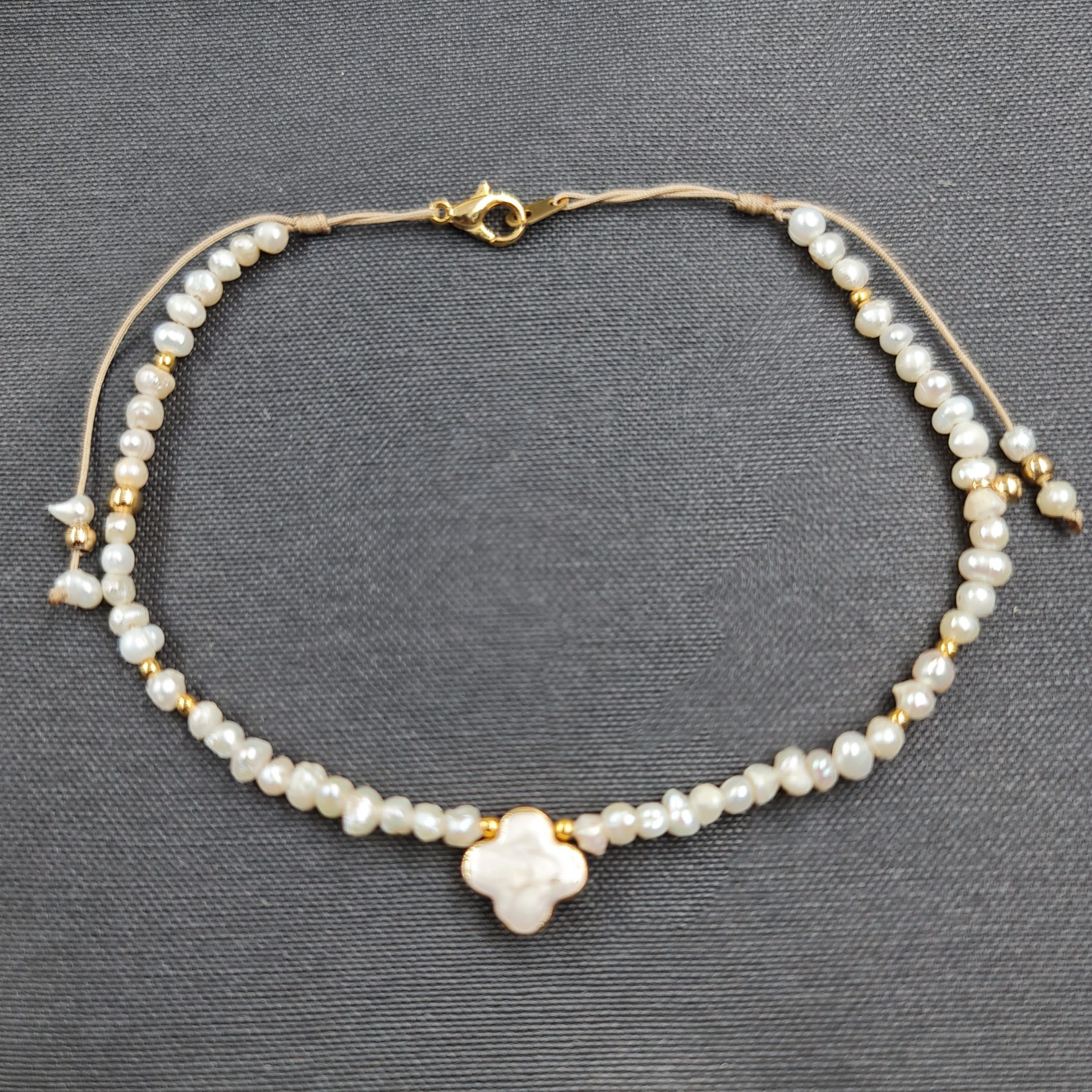 Bracelet de cheville fait de petites perles d’eau douce. Finitions acier inoxydable. Réglable et résistant à la vie de tous les jours.