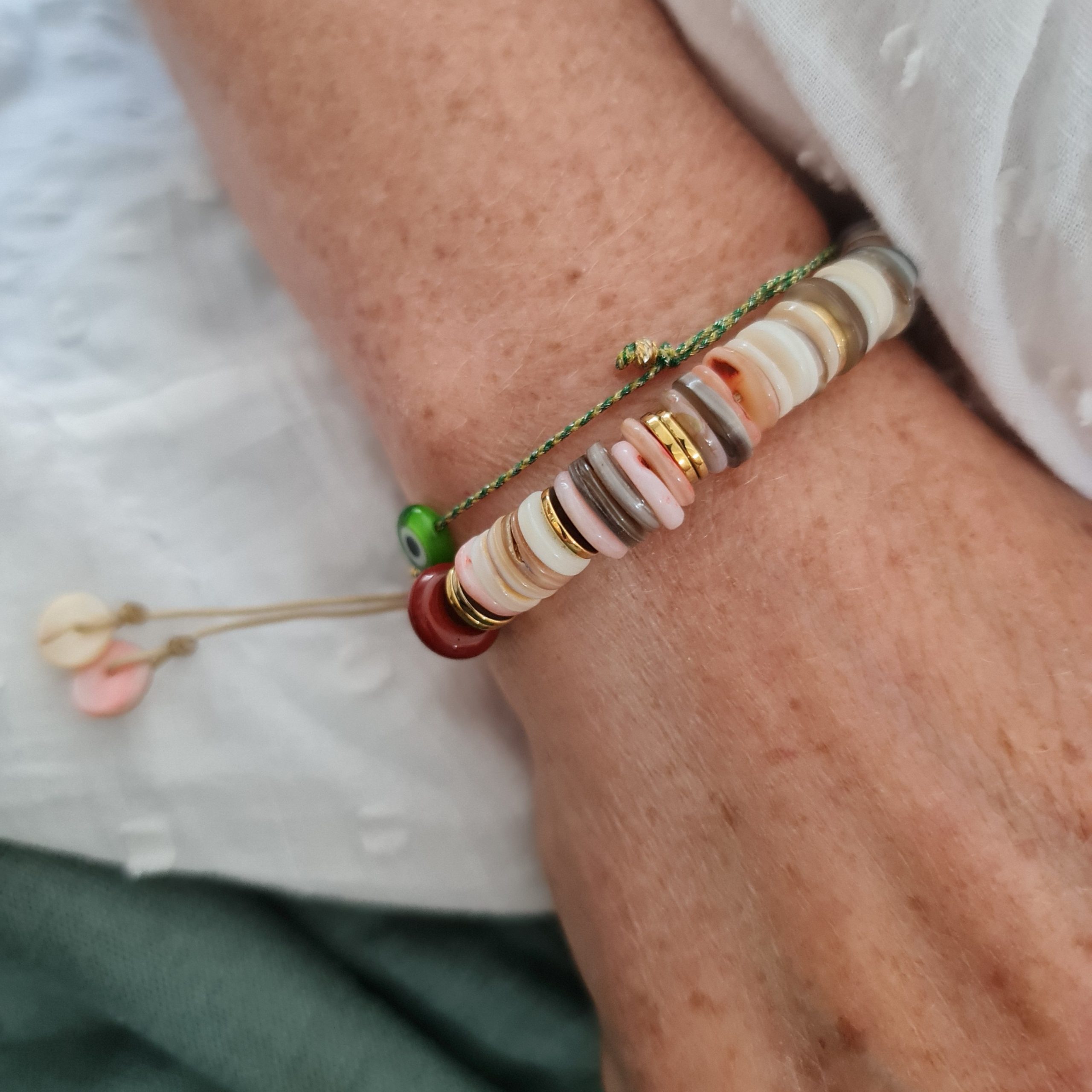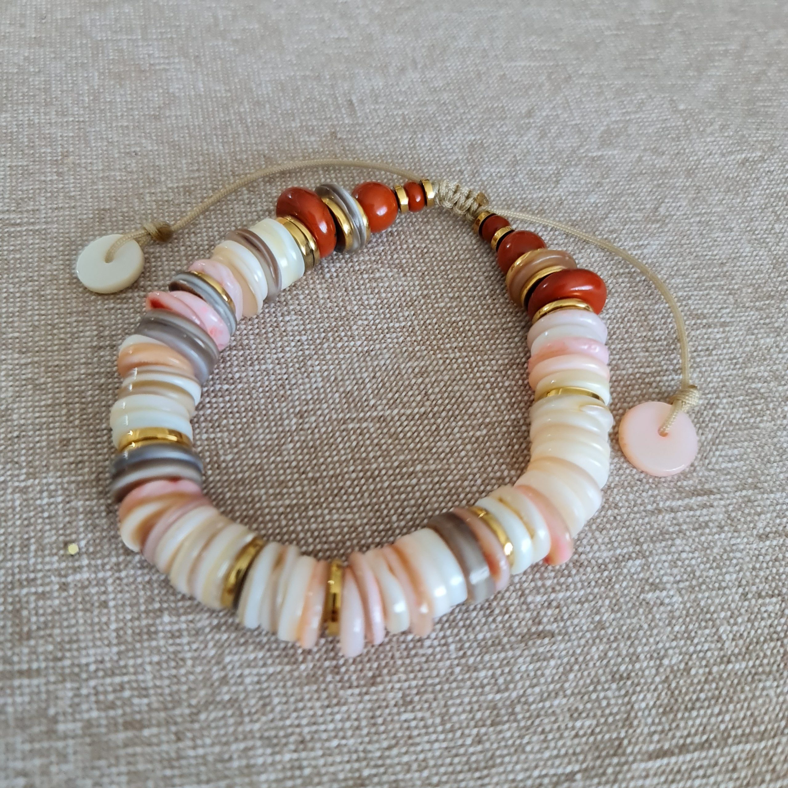 Ce bracelet est composé de perles rondelles heishi, perles rondelles hématite doré et jaspe rouge. Fermeture coulissante. Résistant à l’eau.