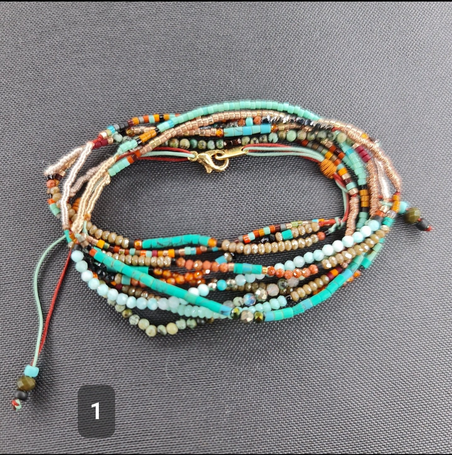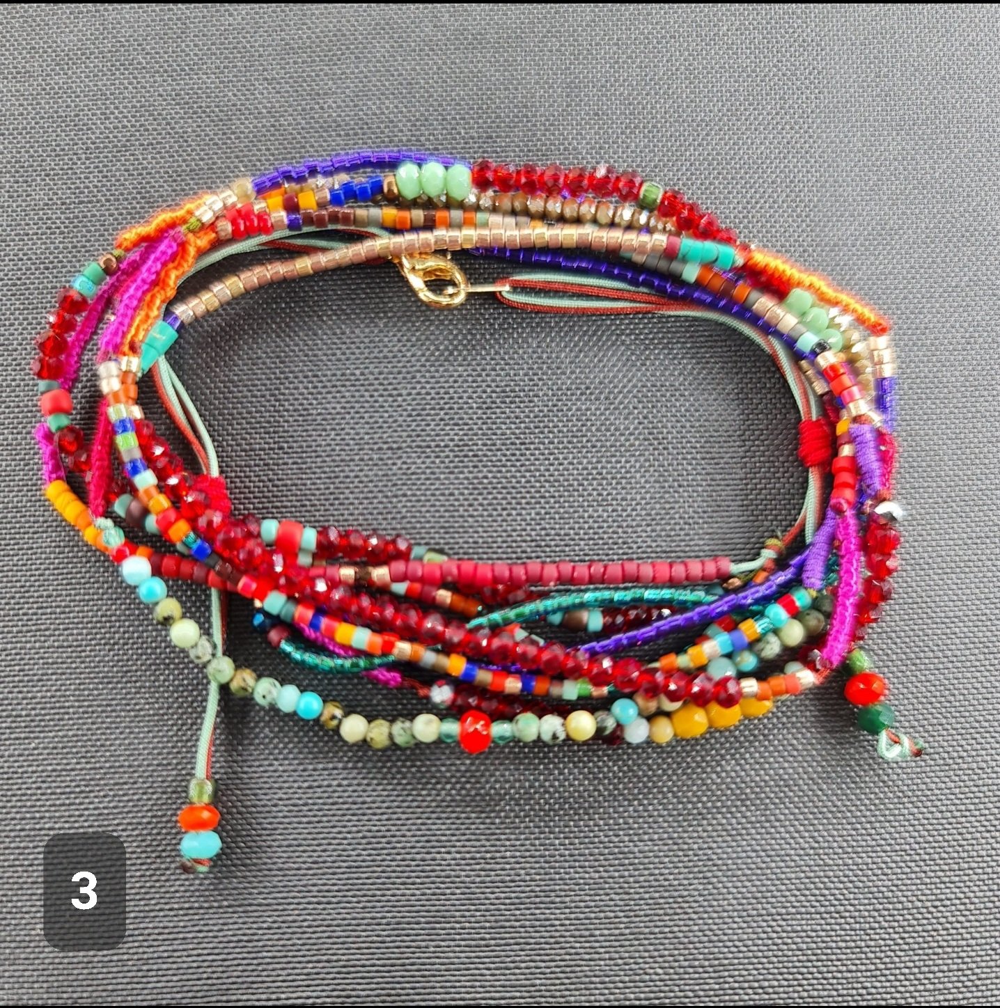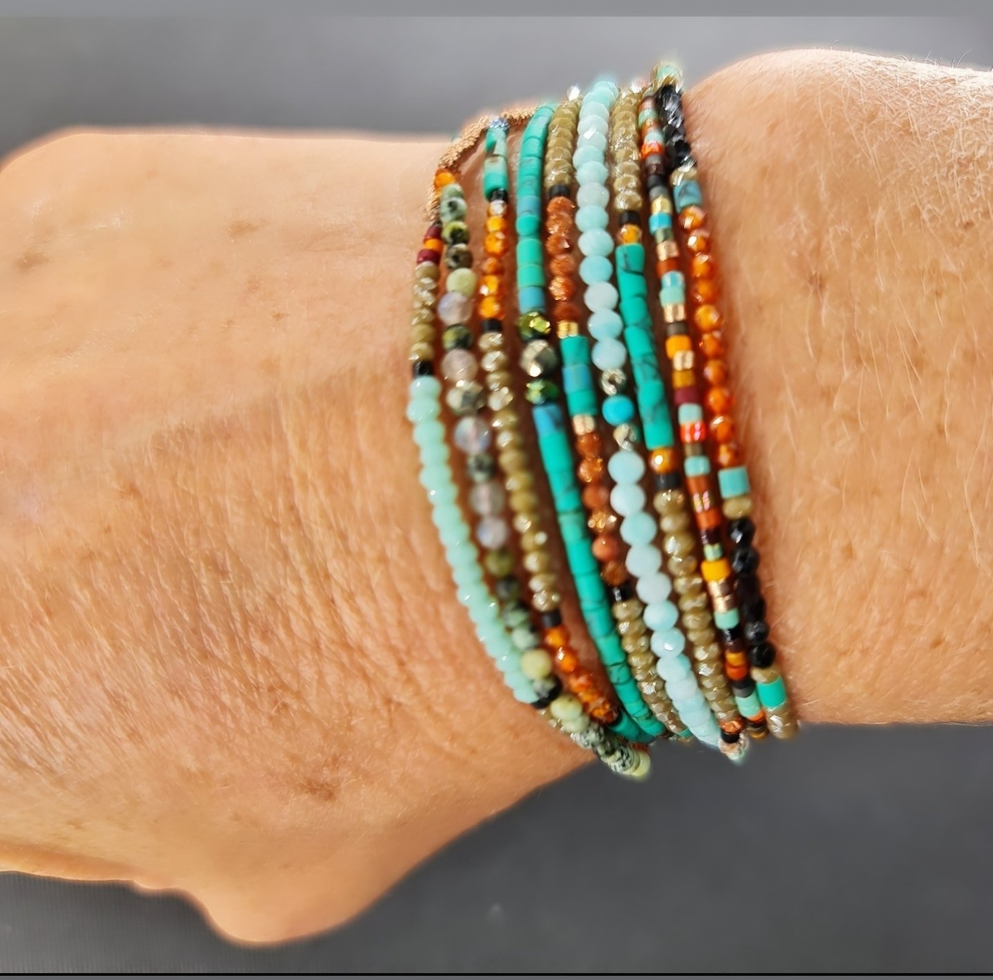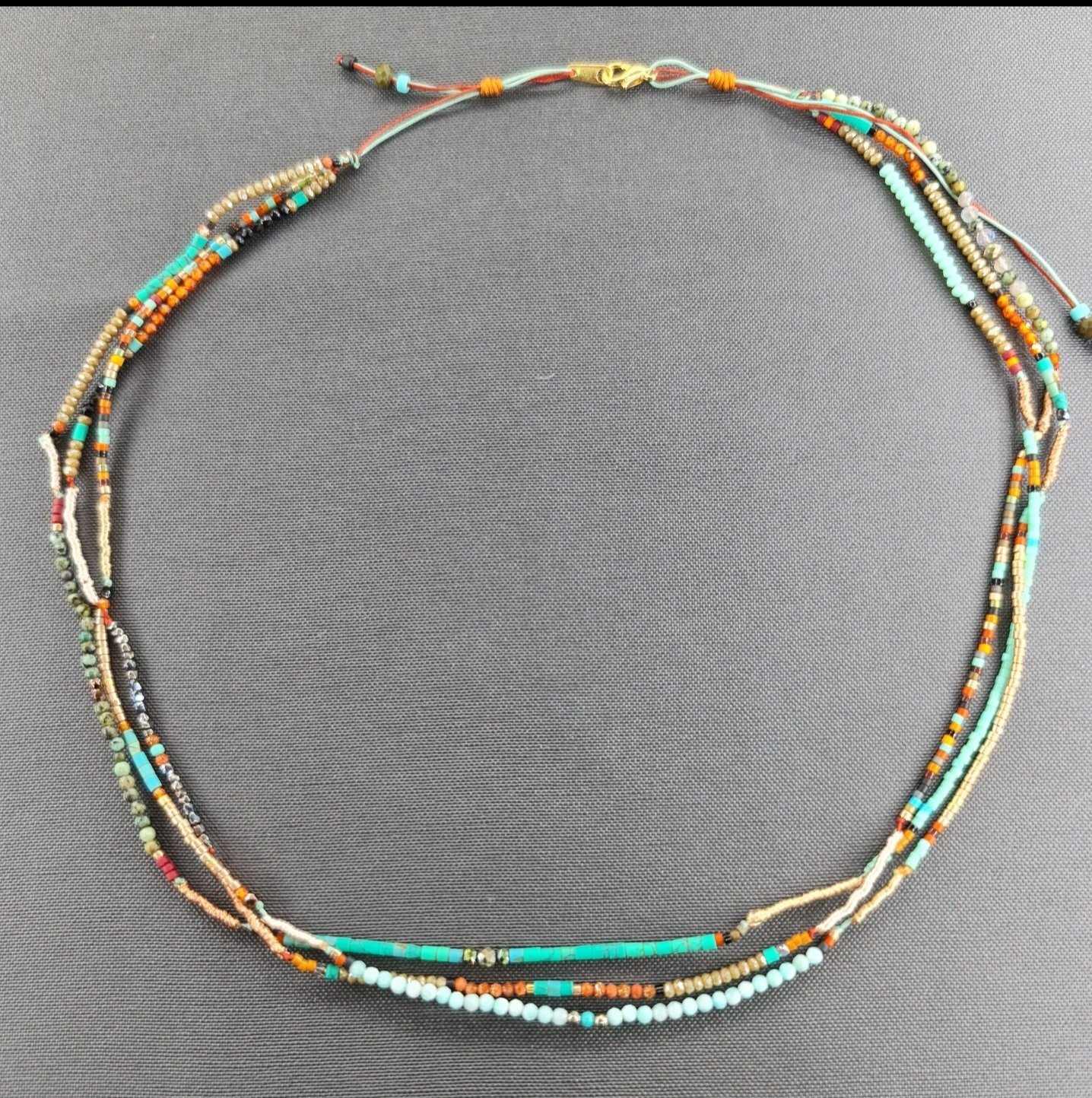 Bracelet multitours qui se porte également en collier 3 rangs. Un joli mélange de petites perles semi-précieuses enfilées sur trois rangs de cordon solide. Ce bijou est résistant à la vie de tous les jours. Finitions acier inoxydable. longueur déployée 46 cm avec un système de réglage pour s’adapter à toutes les tailles.