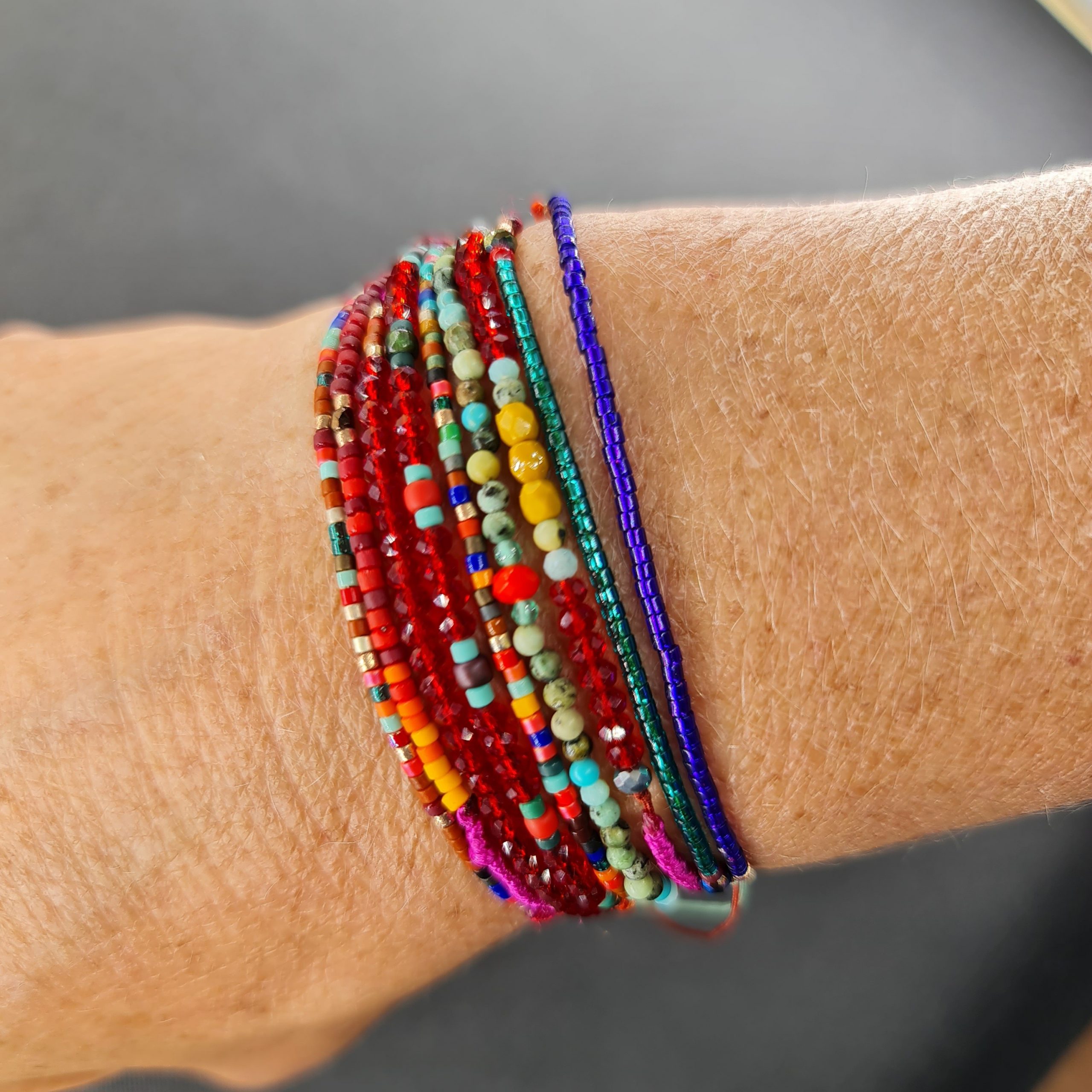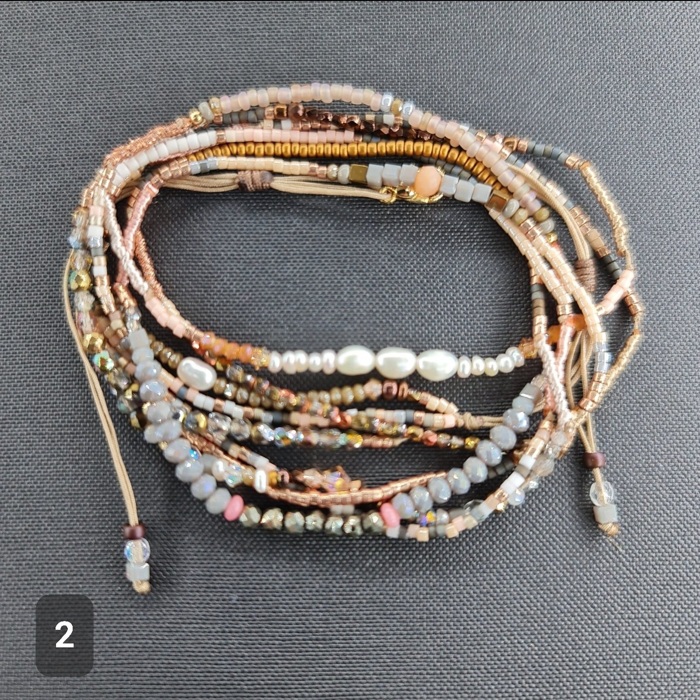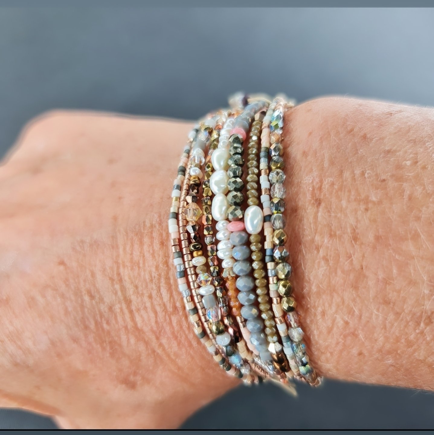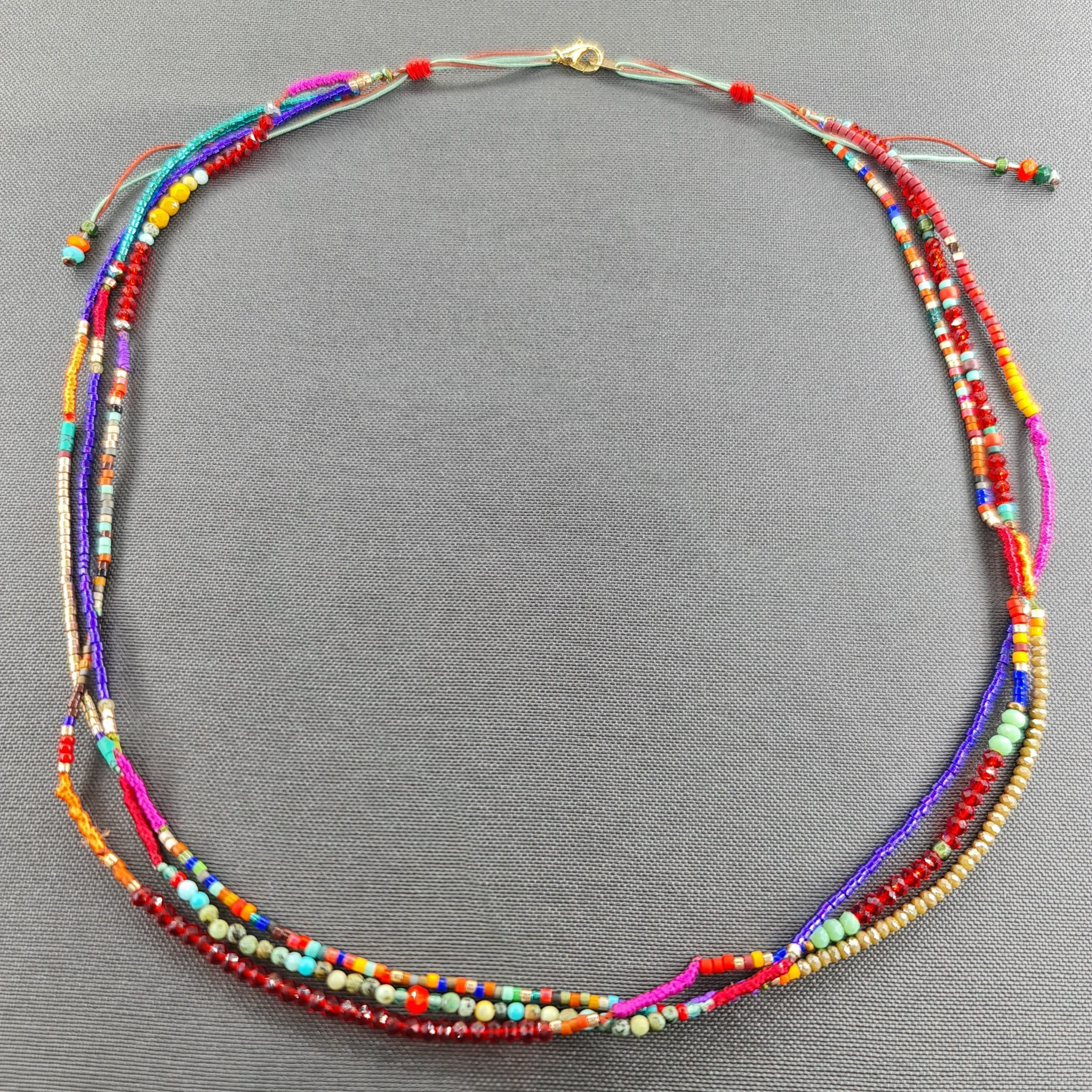 Bracelet multitours qui se porte également en collier 3 rangs. Un joli mélange de petites perles semi-précieuses enfilées sur trois rangs de cordon solide. Ce bijou est résistant à la vie de tous les jours. Finitions acier inoxydable. longueur déployée 46 cm avec un système de réglage pour s’adapter à toutes les tailles.