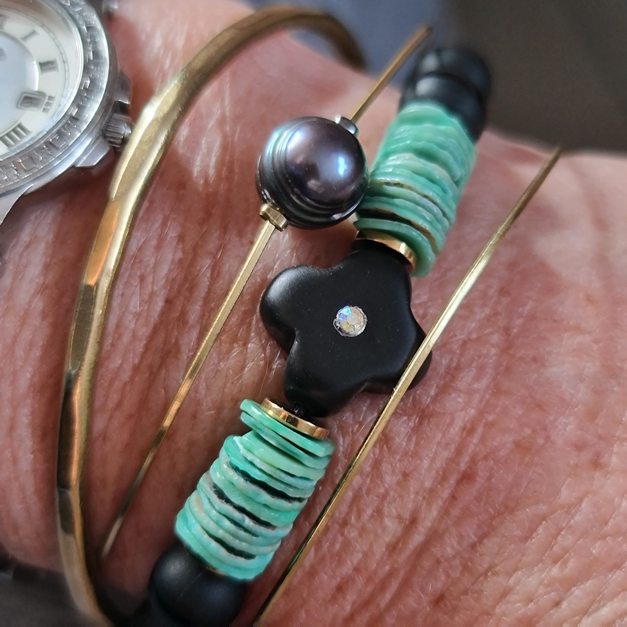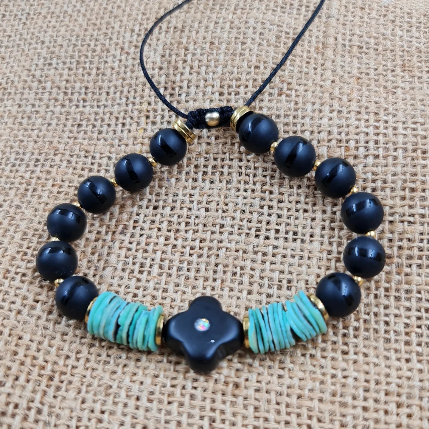 Bracelet perles d’onyx et coquillages heishi. Résistant à l’eau.