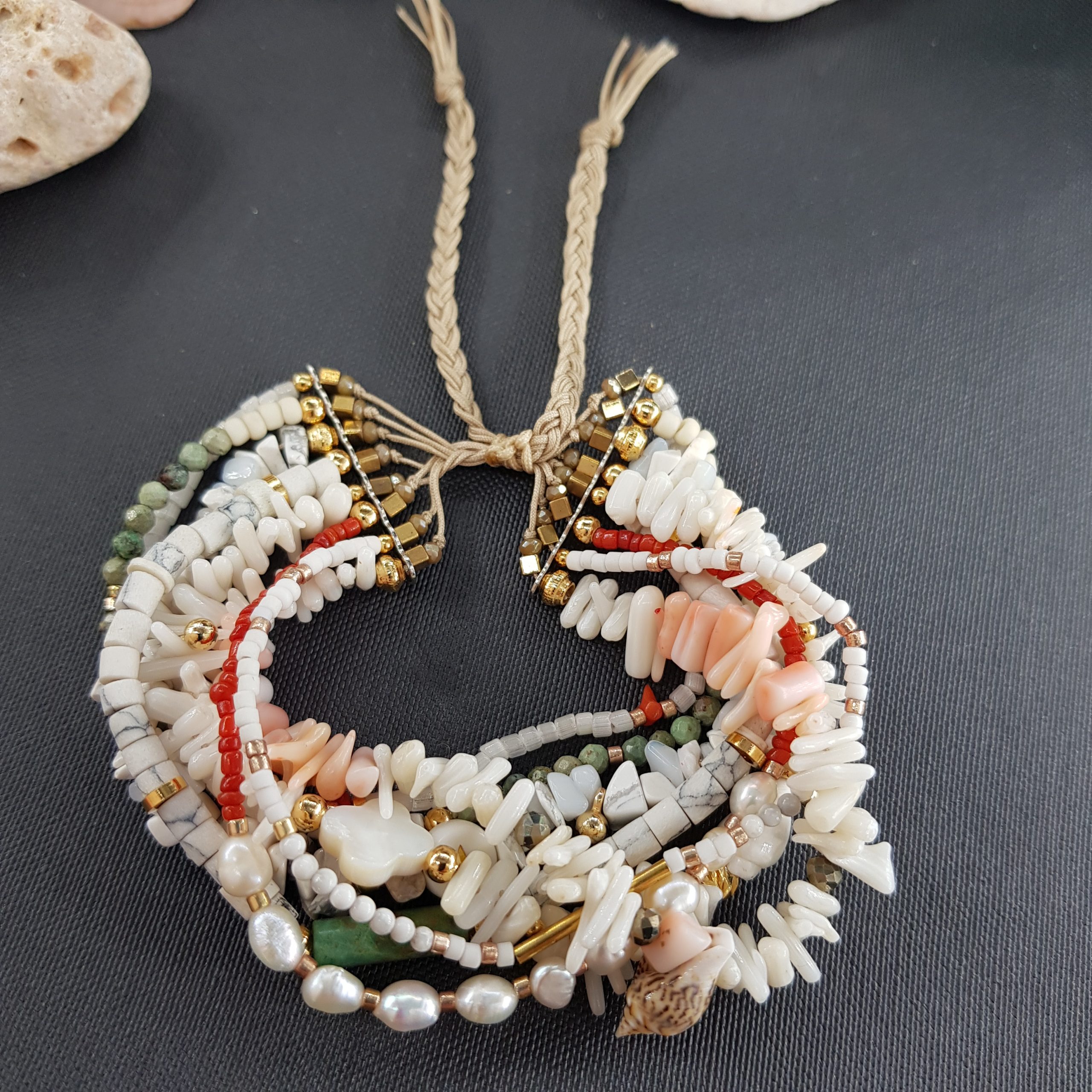 Bracelet manchette »Zanna » composé de 8 rangs de perles semi-precieuses et coquillages. Fermeture coulissante.