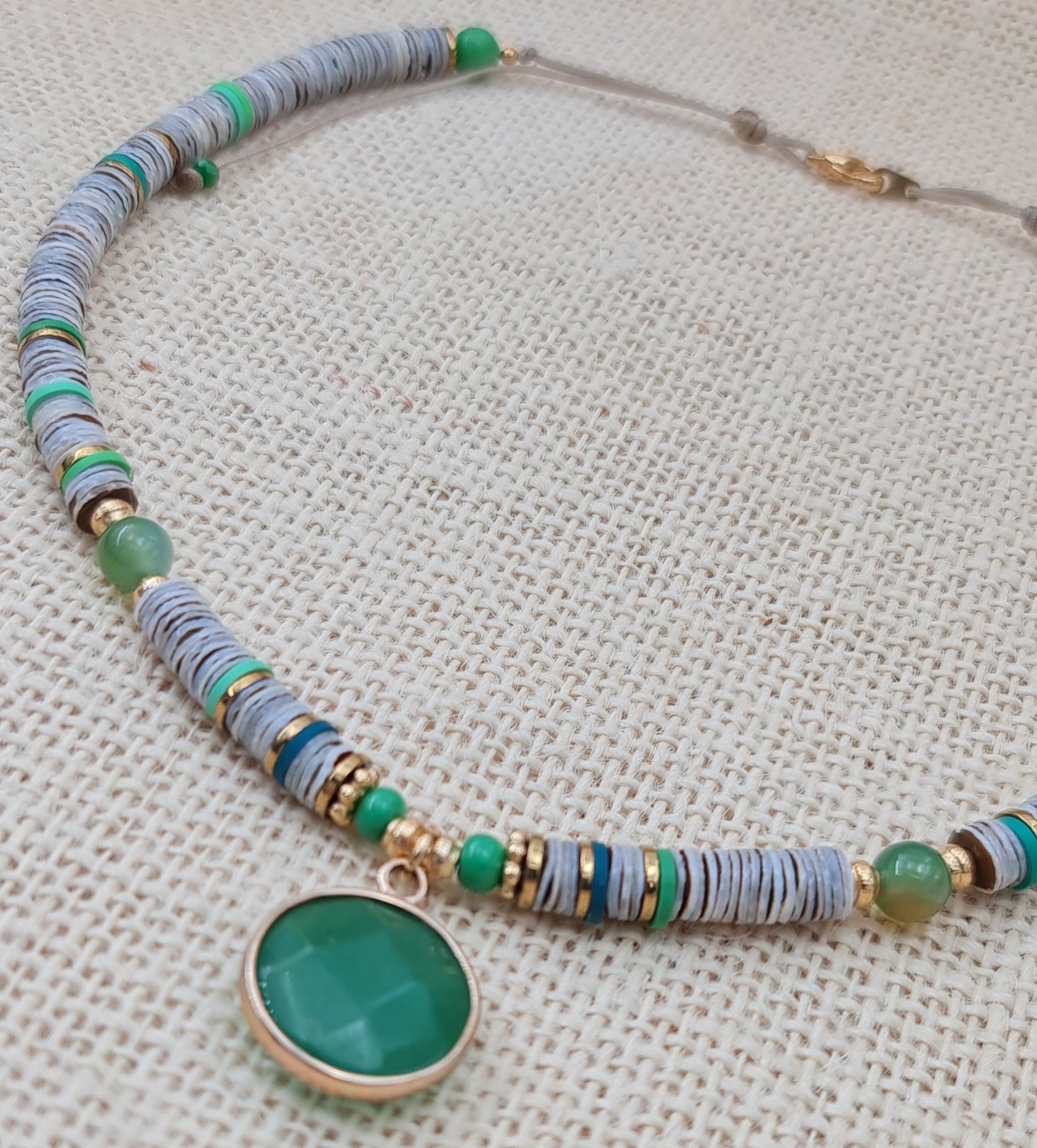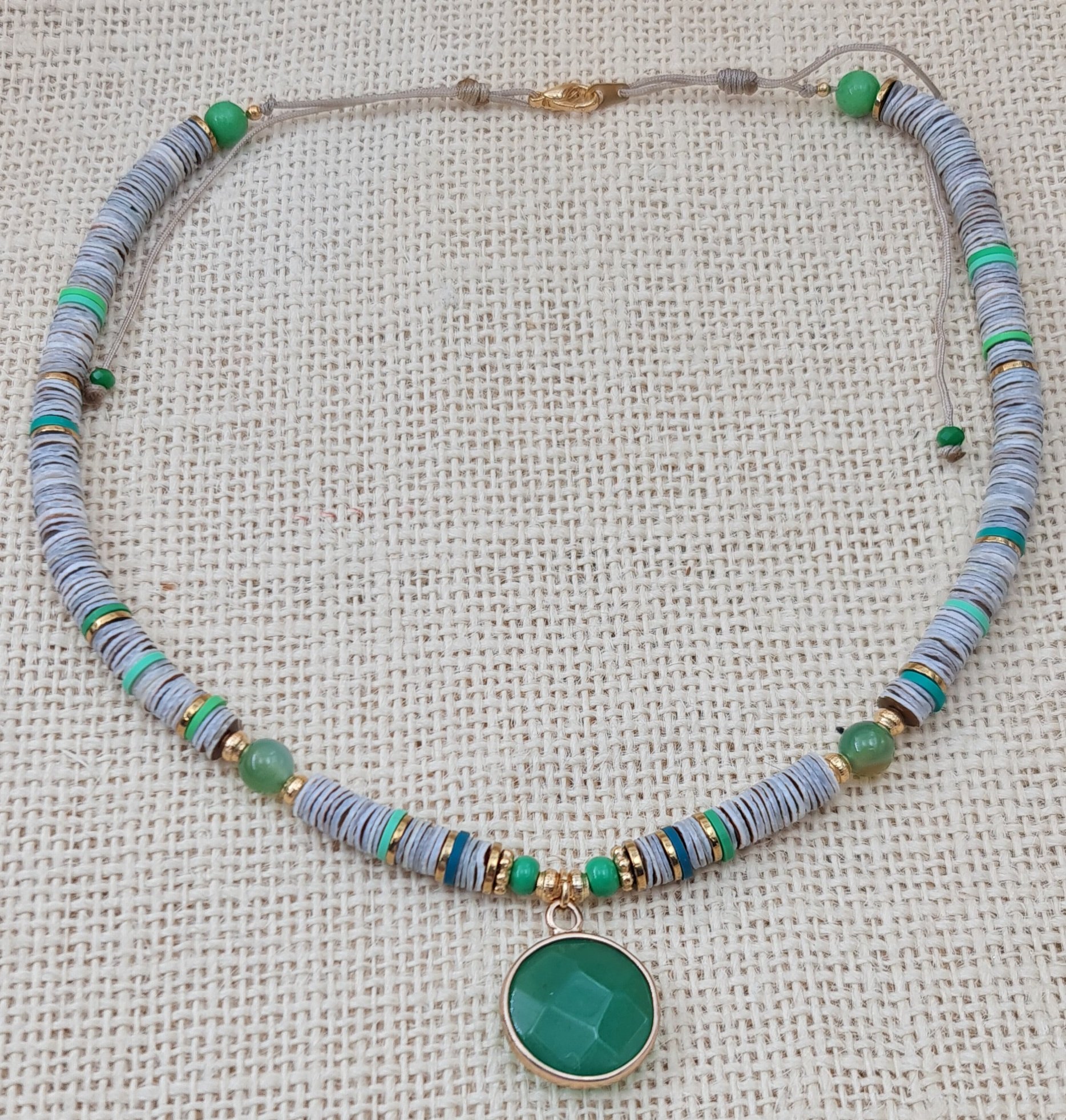 Collier de perles rondelles heishi orné d’un grand pendentif en pierre naturelle d’aventurine. Finitions et fermoiracierinoxydable.