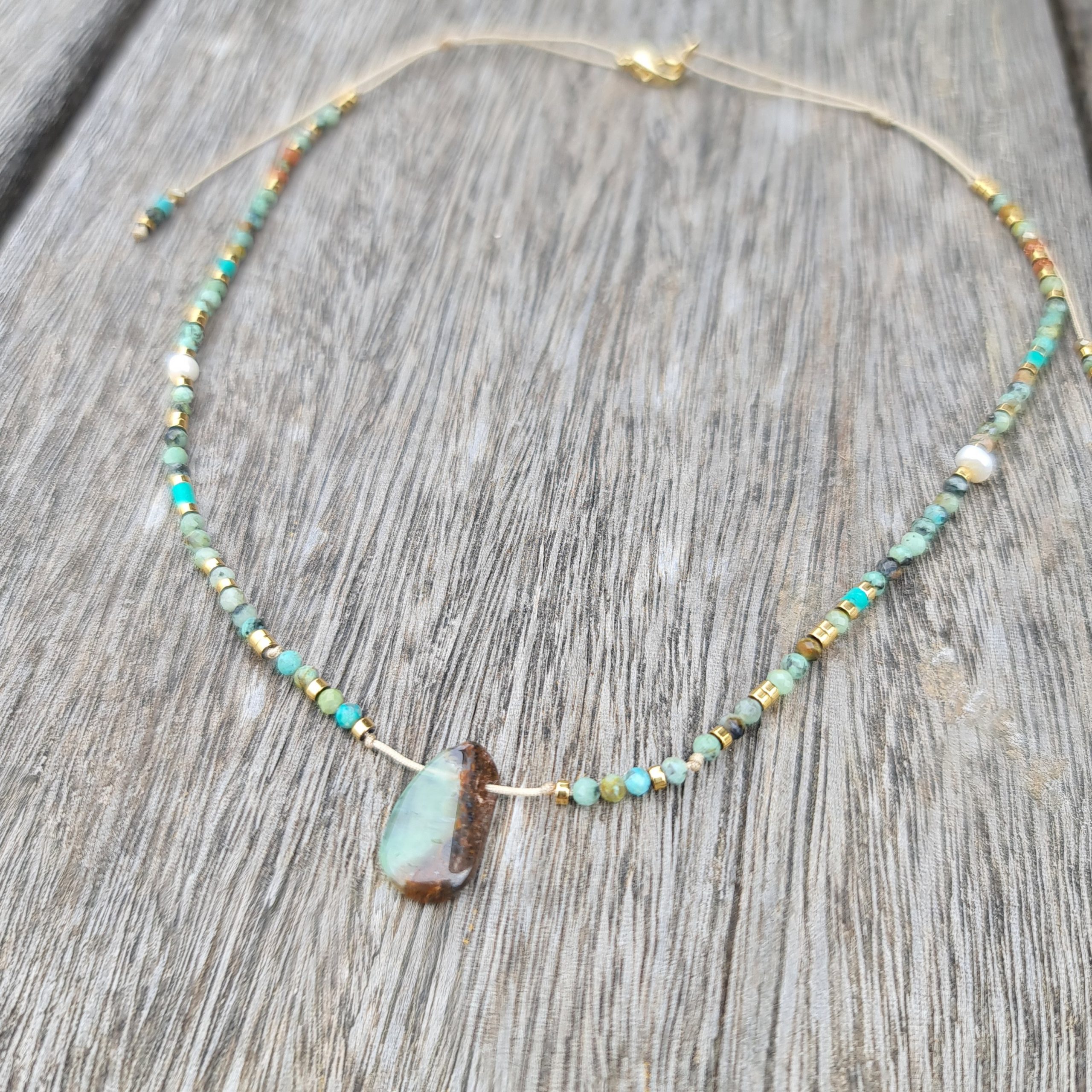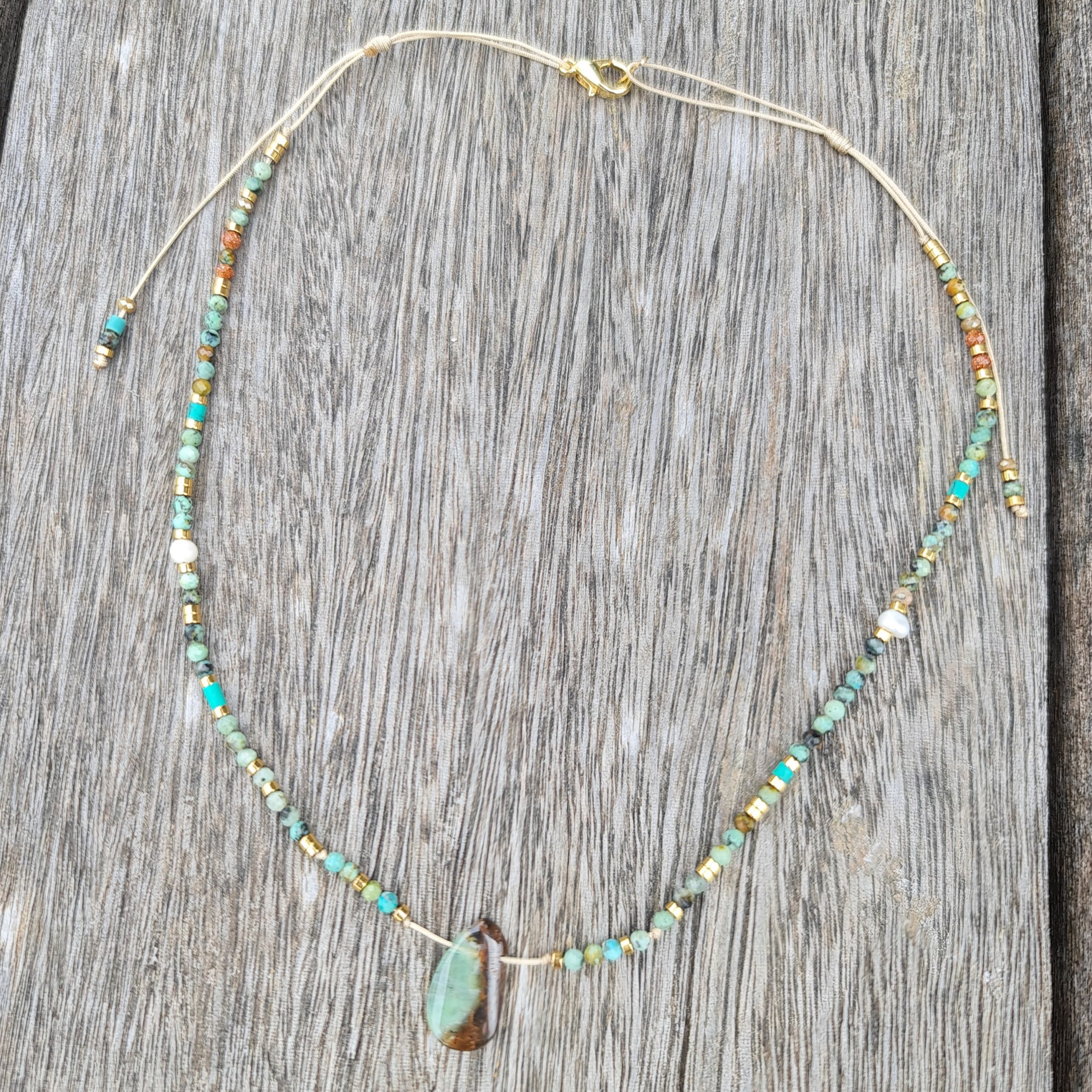 Très joli collier fait de perles semi-précieuses turquoise africaine et une perle de Chrysoprase en forme de larme. Résistant à l’eau. Fermeture réglable.