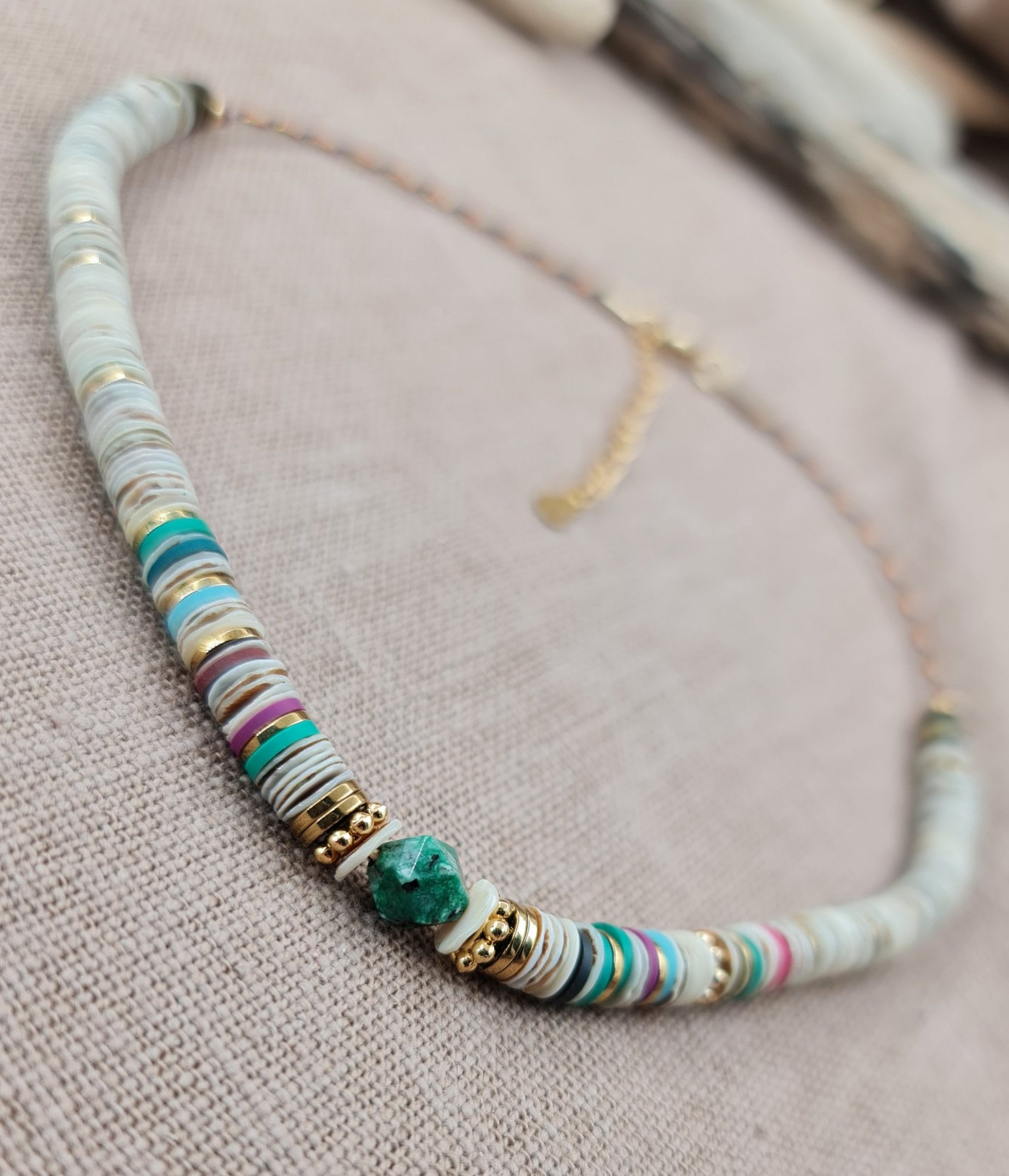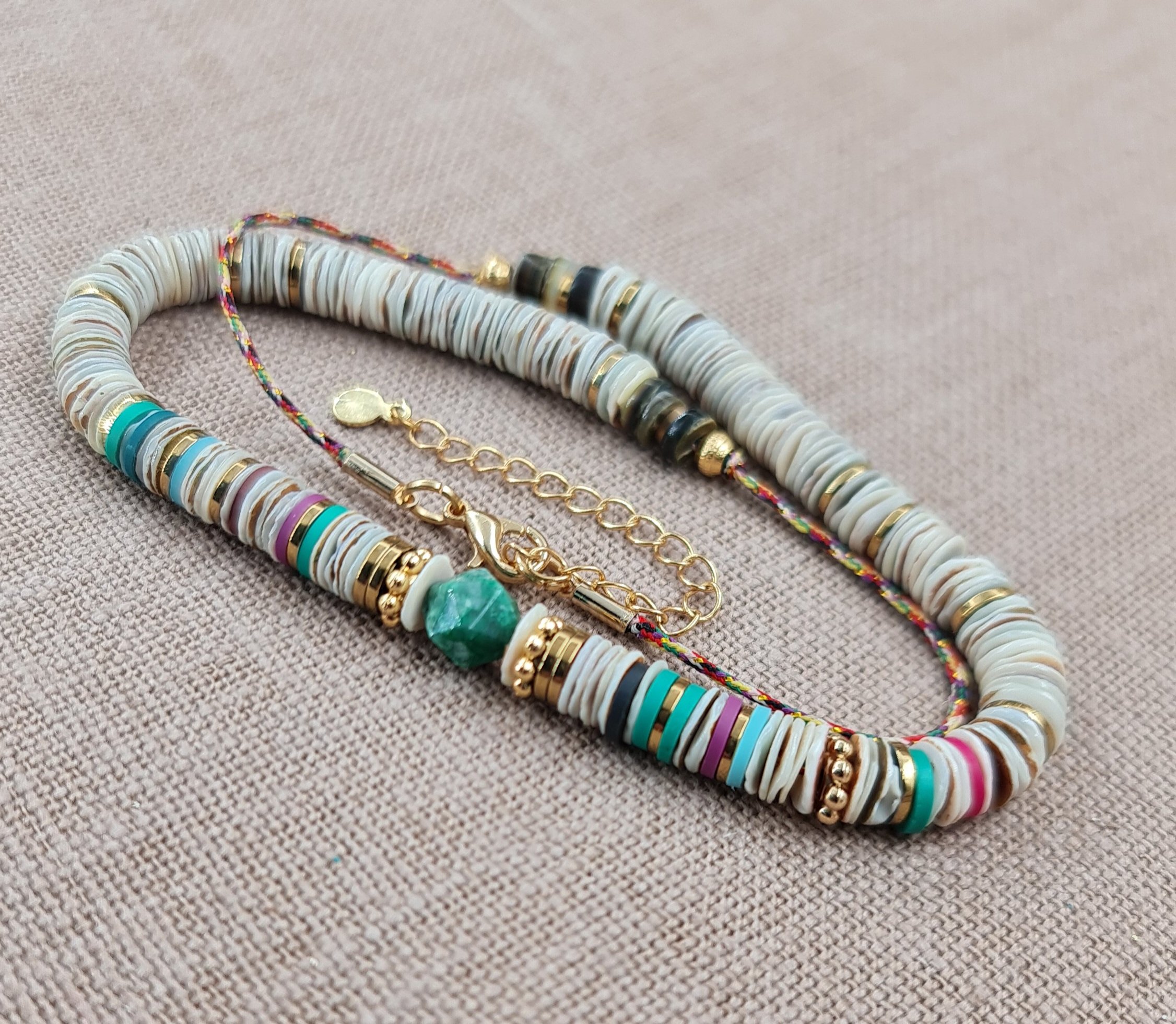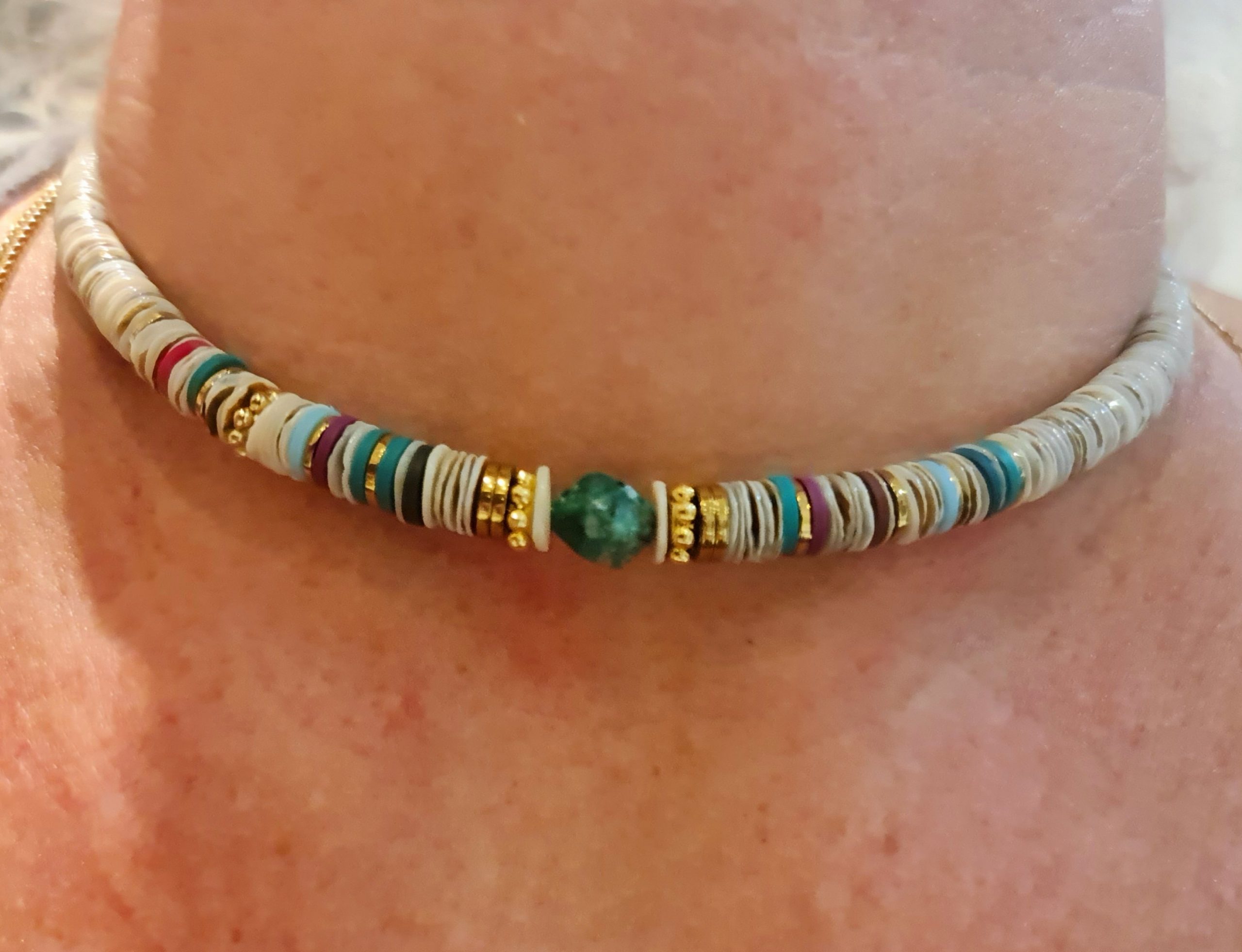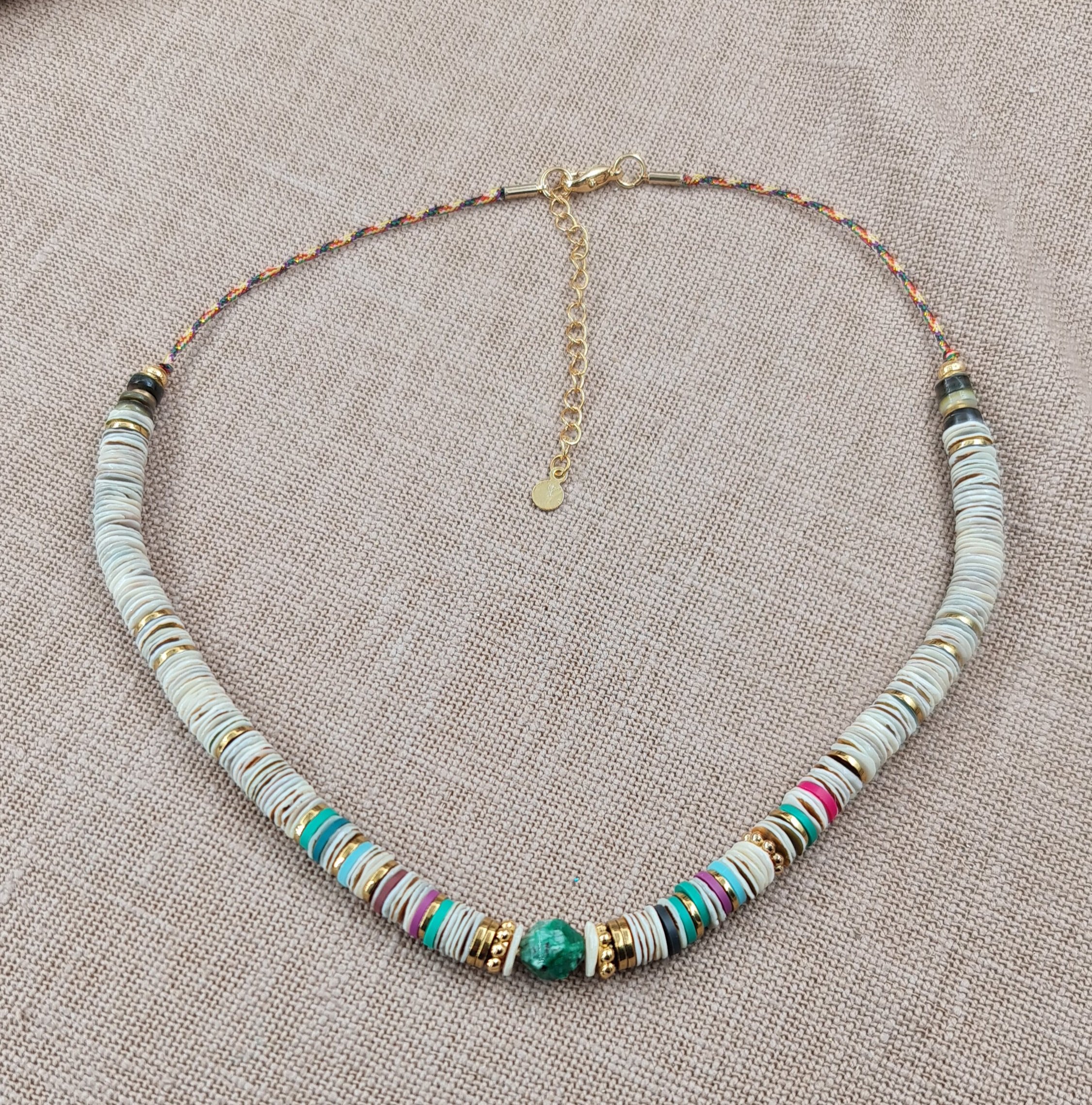 Joli collier aux allures de sufer. Il est fait de perles heishi coquillages, quelques perles d’hématite dorées et une perle de jaspe kiwi. Enfilées sur un cordon multicolore. Longueur déployée 38 cm plus 6 cm de chaînette en acier inoxydable.