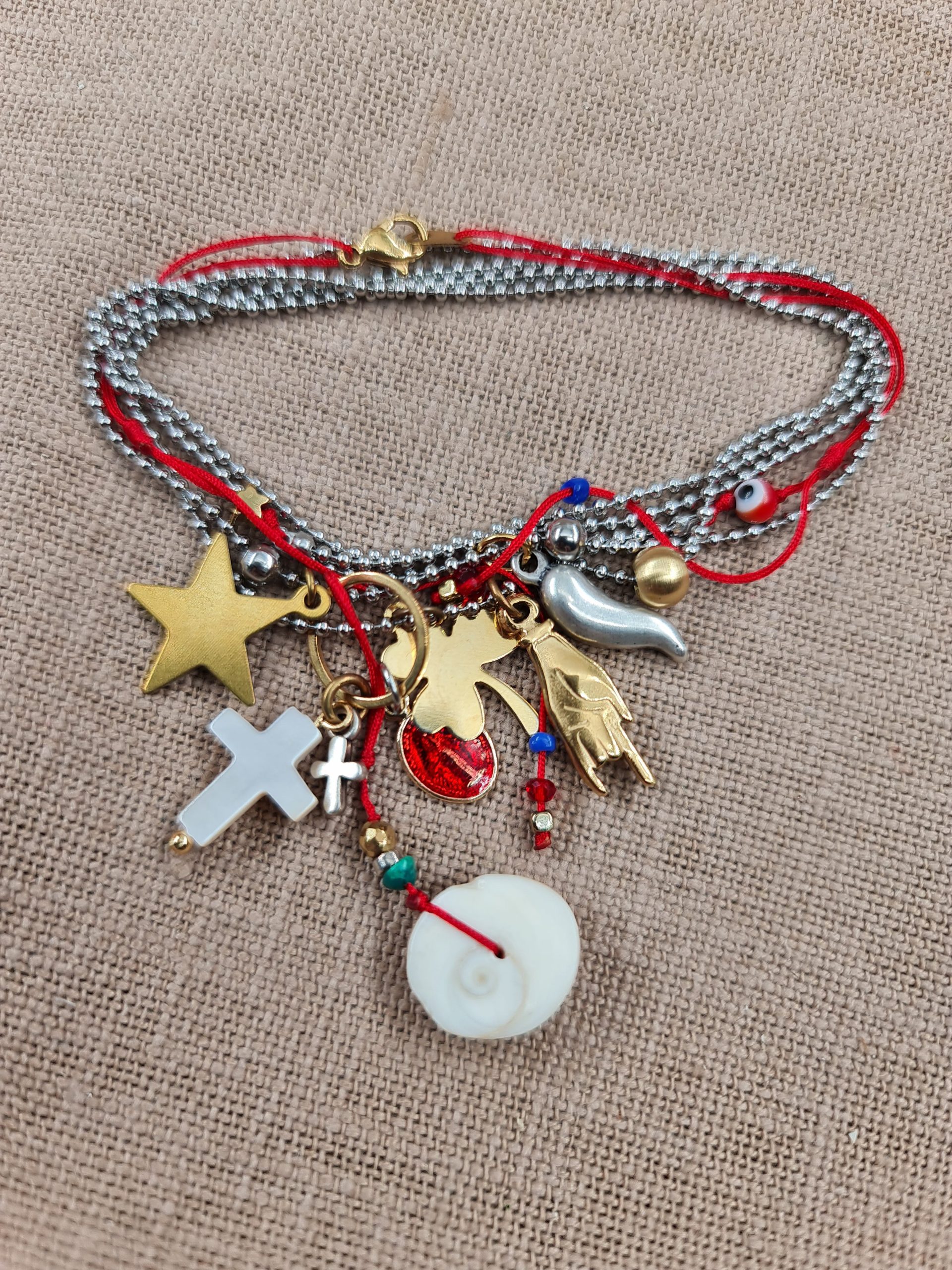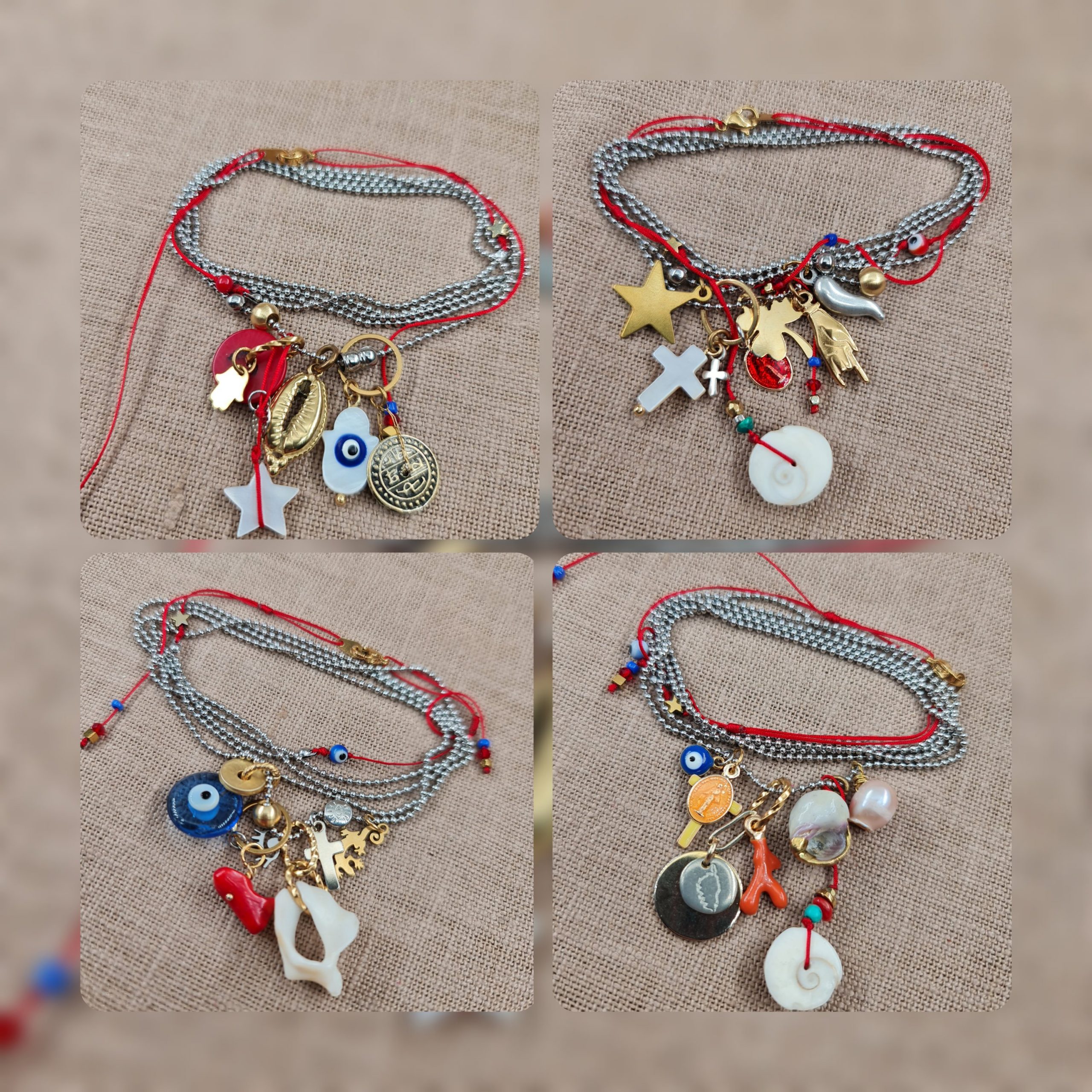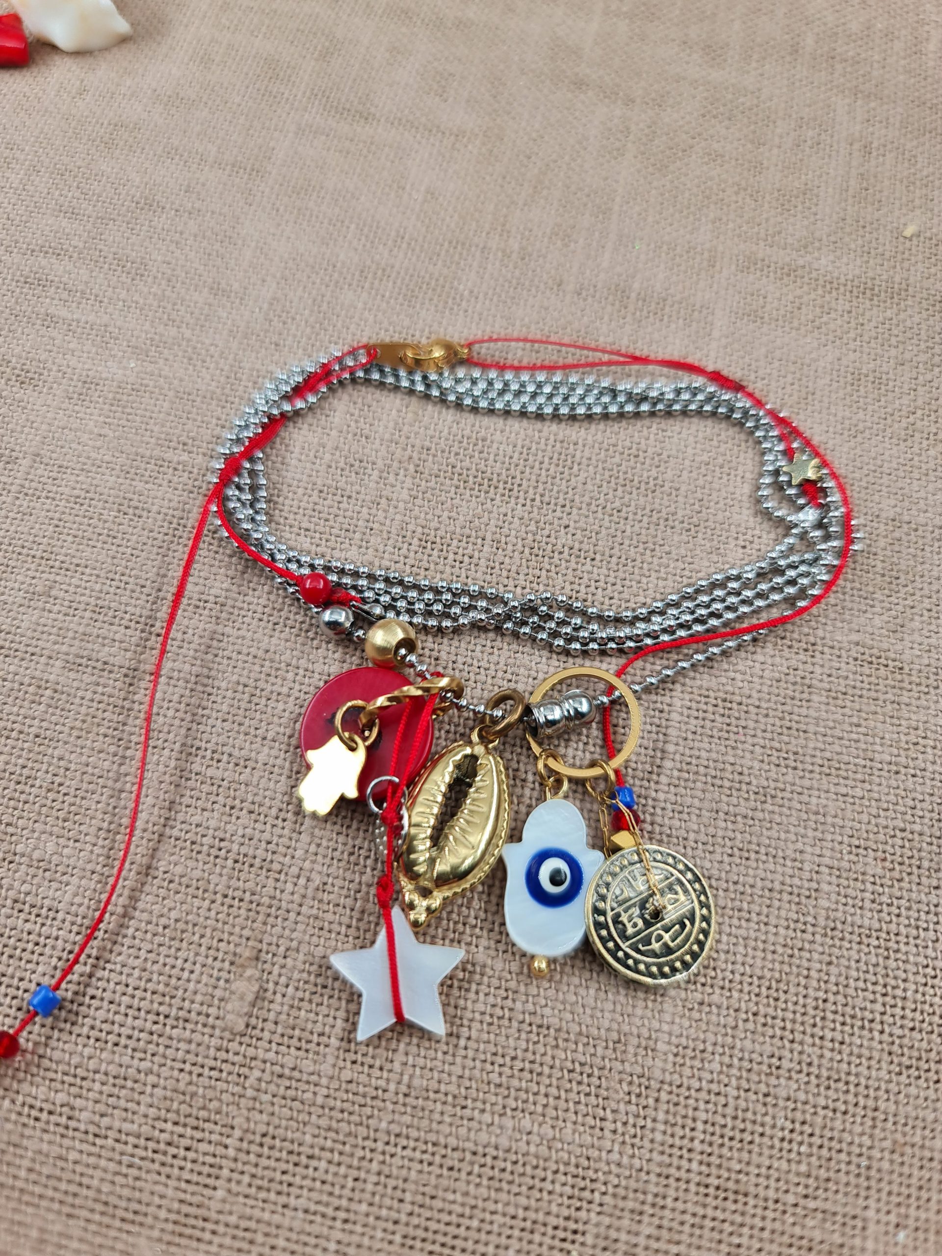 Collier porte-bonheur. Chaîne acier. 1 gri-gri orientale / 2 gri-gri chrétien/ 3 gri-gri les iles/ 4 gri-gri Corse.