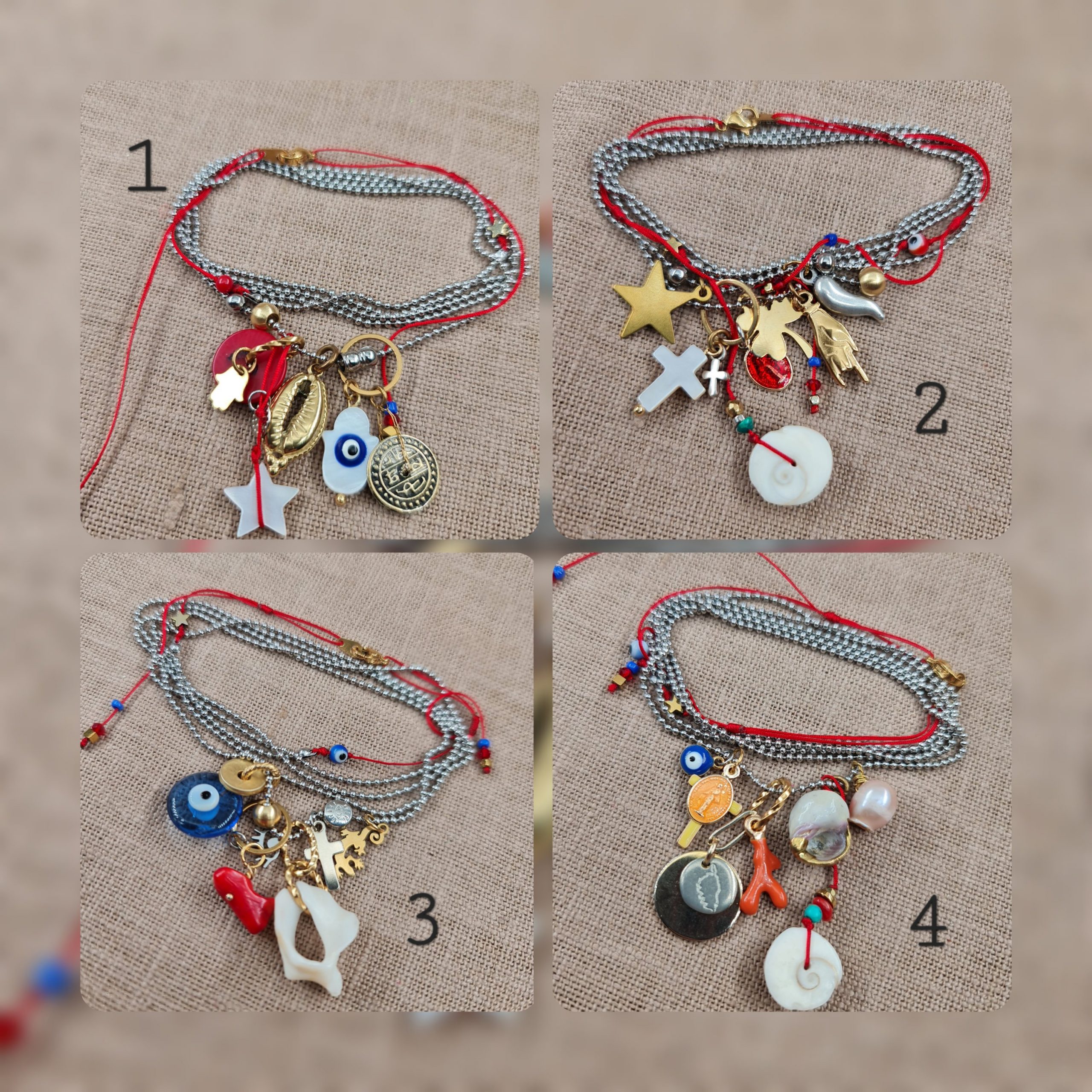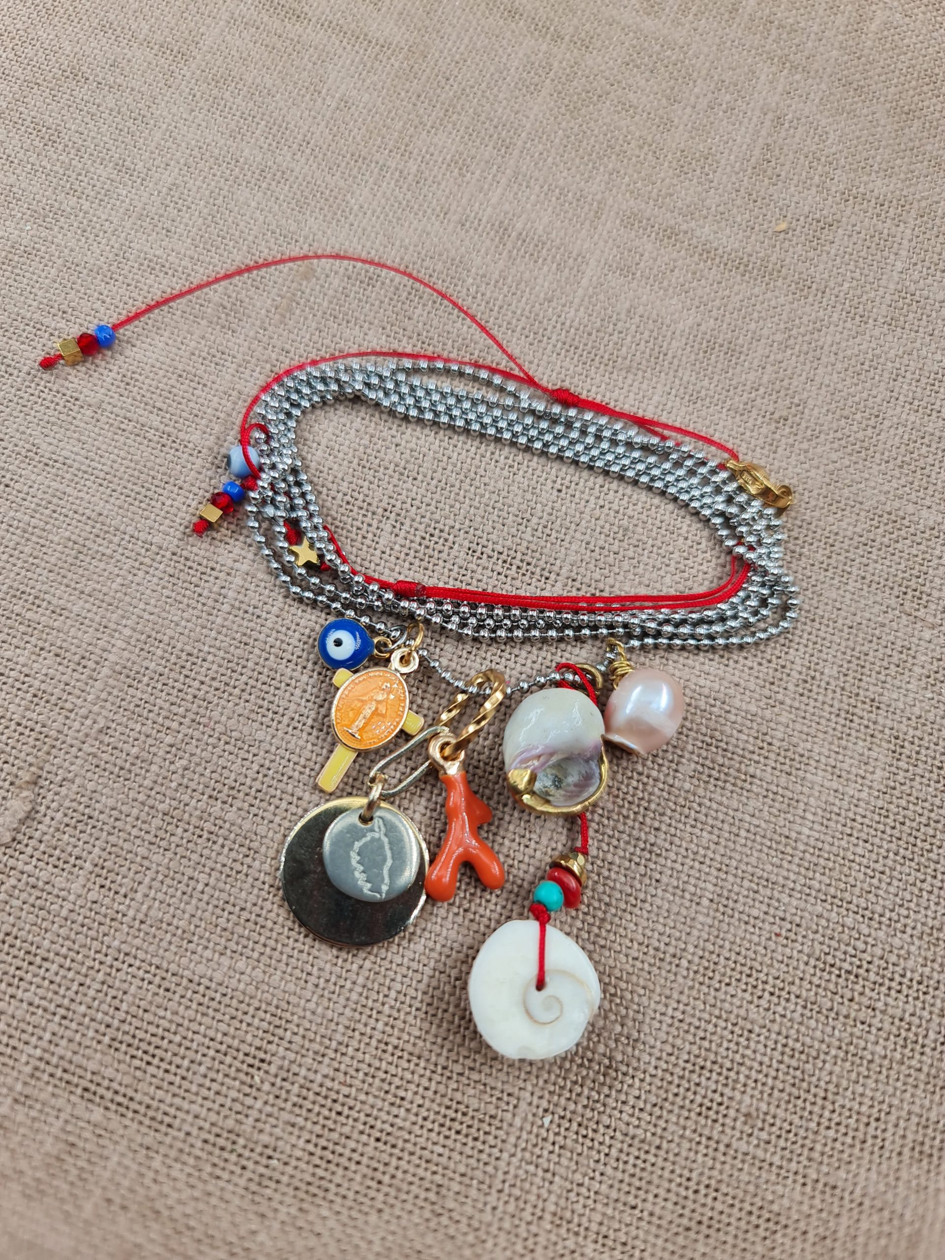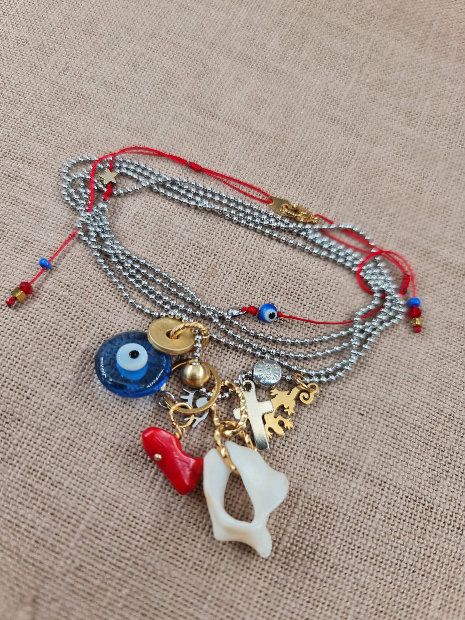 Collier porte-bonheur. Chaîne acier. 1 gri-gri orientale / 2 gri-gri chrétien/ 3 gri-gri les iles/ 4 gri-gri Corse.