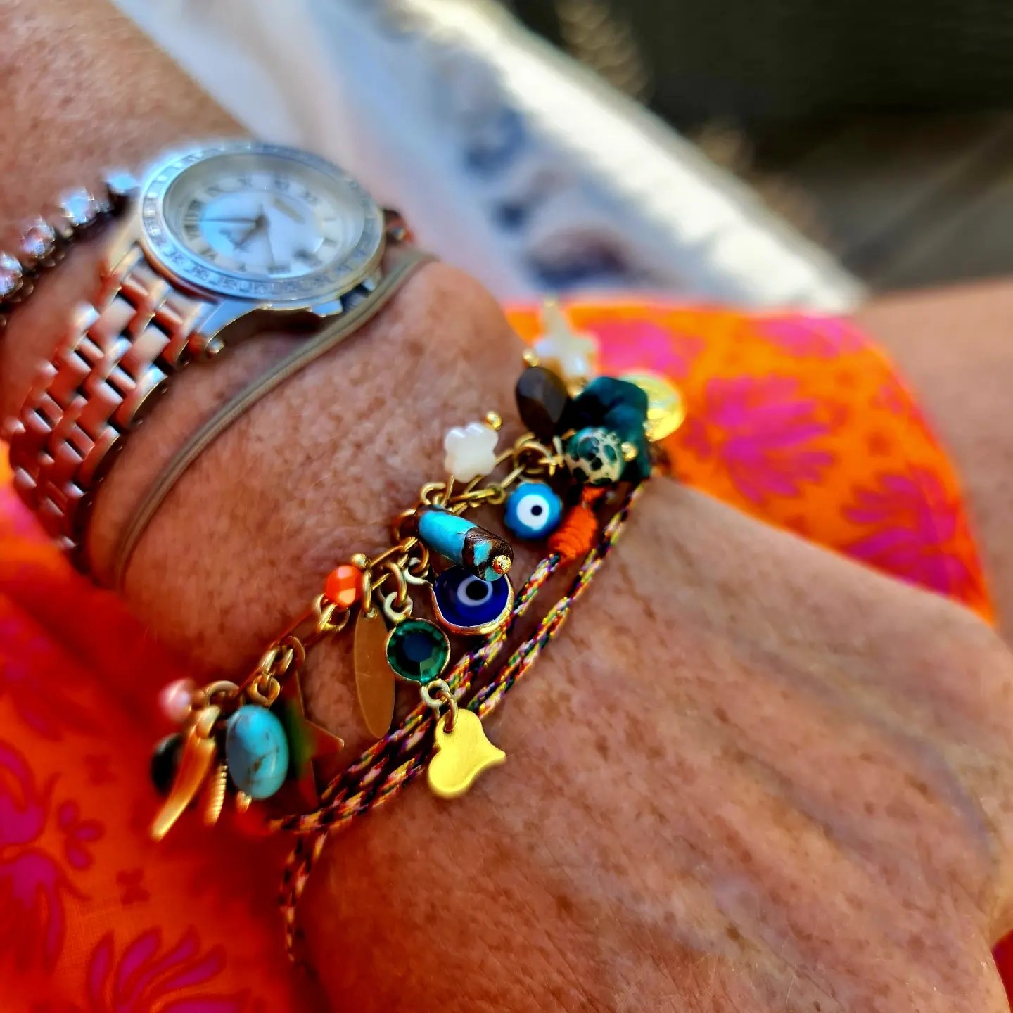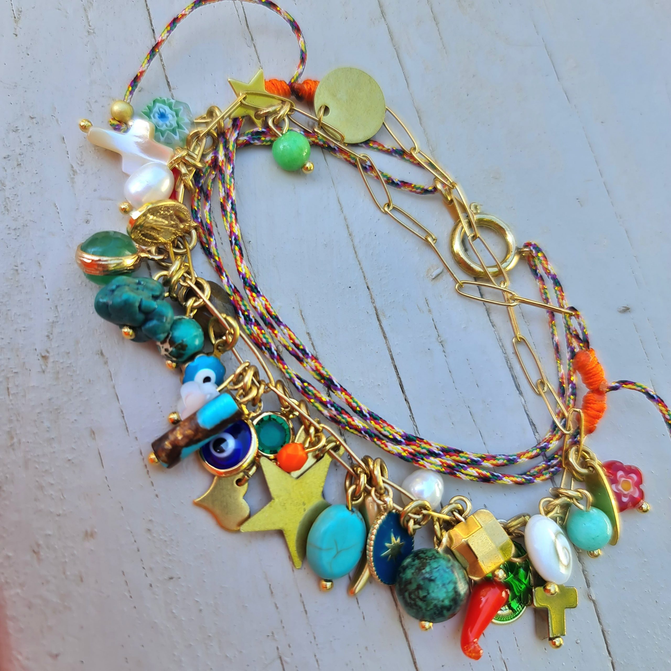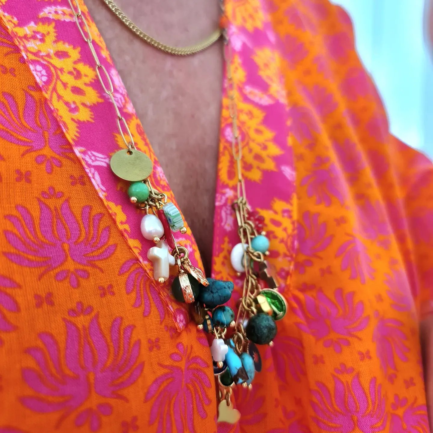 Beau collier gri-gri qui se porte de multiples manières. Il est composé de chaîne acier doré inoxydable de breloques en laiton et acier ainsi que quelques belles perles. Se règle facilement grâce aux nœuds coulissants de chaque côté.