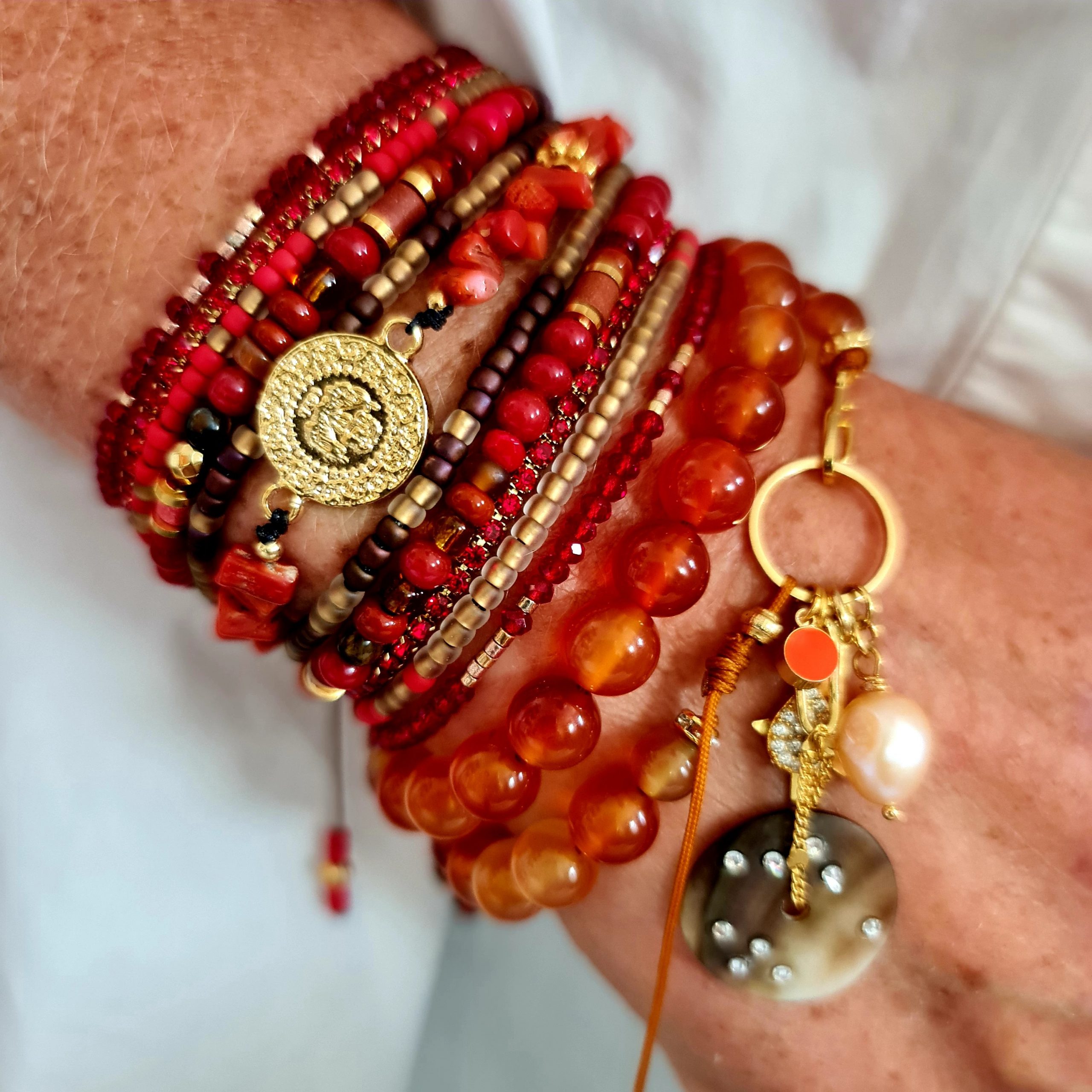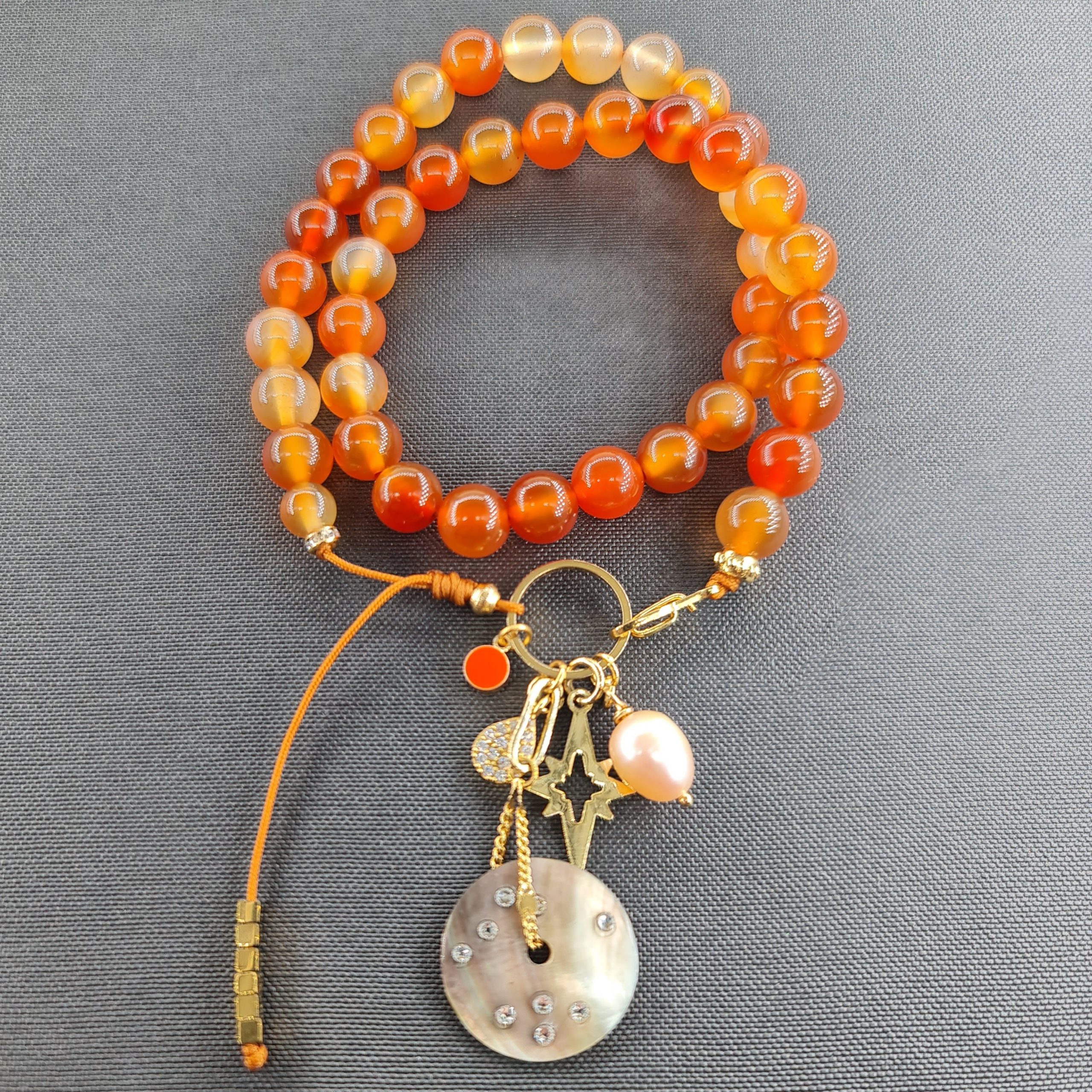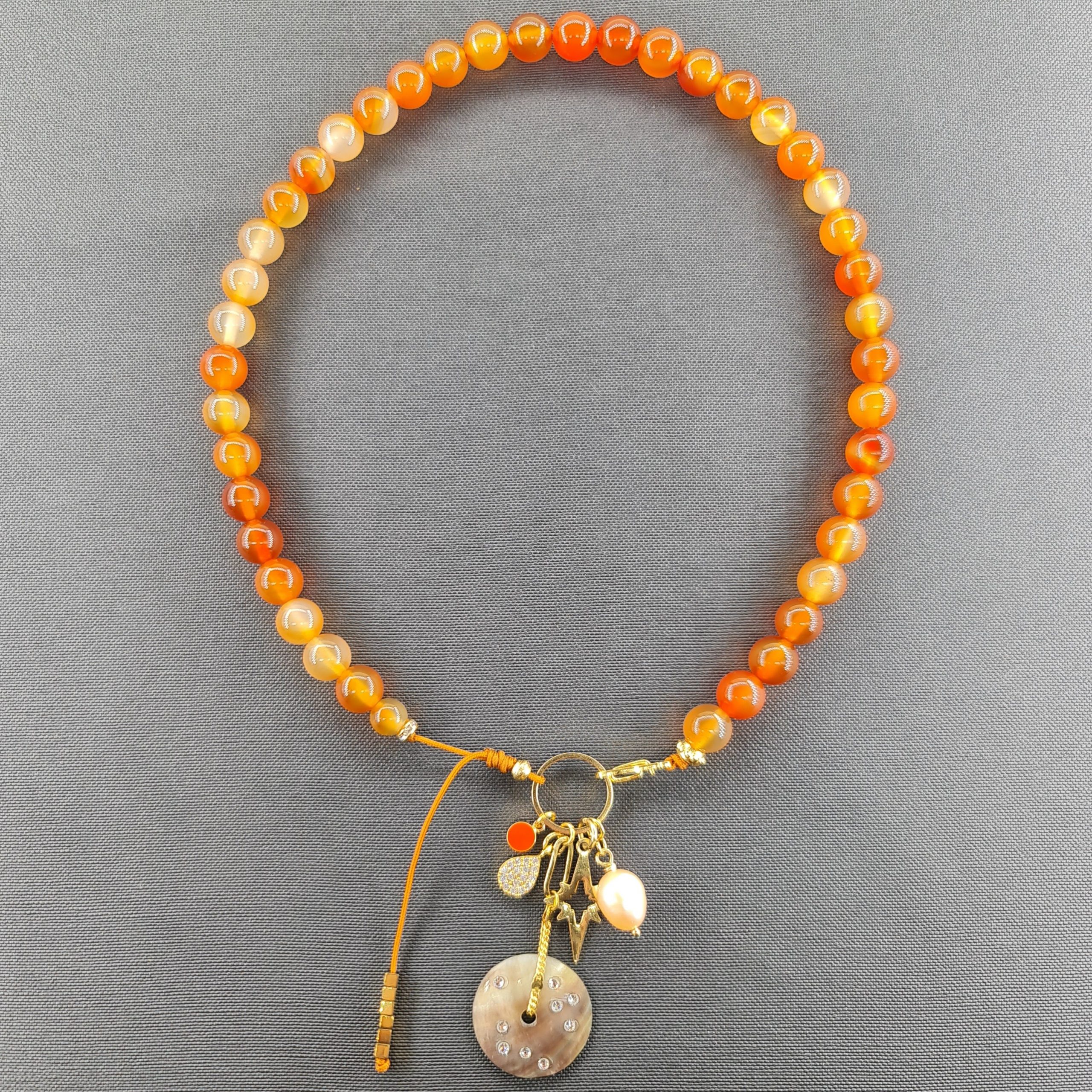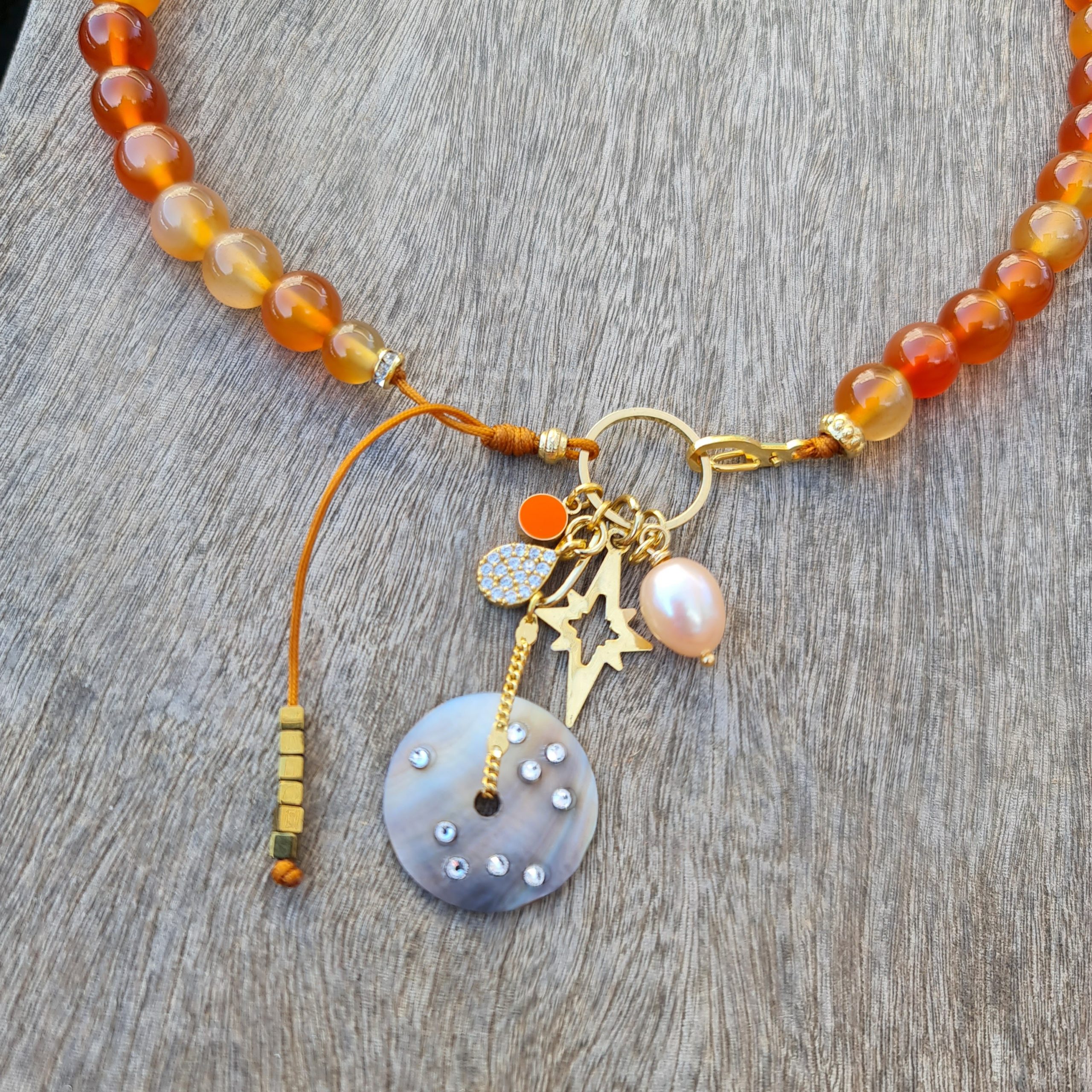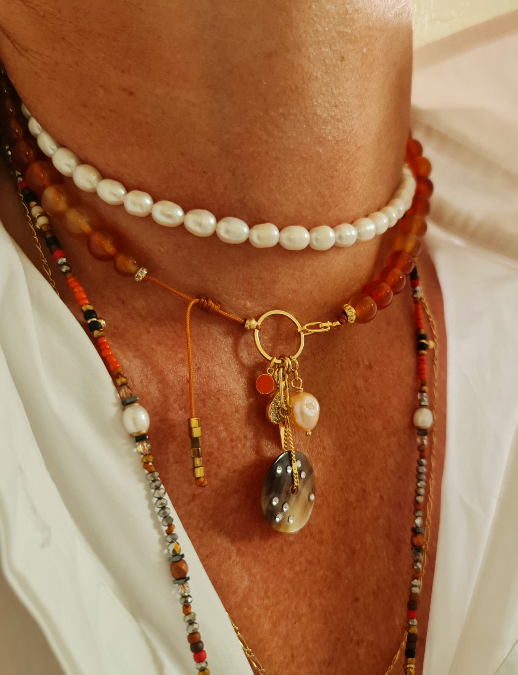 Collier « Jimmy » Composé de belles perles de cornaline orange orné de gri-gri précieux. Il s’accroche à l’avant avec un système de réglage pour l’ajuster.