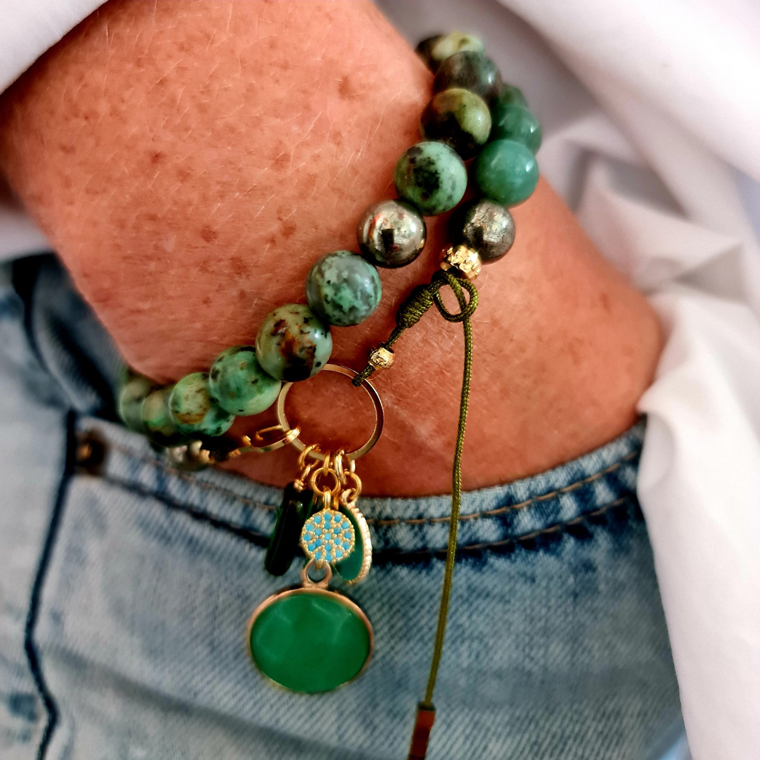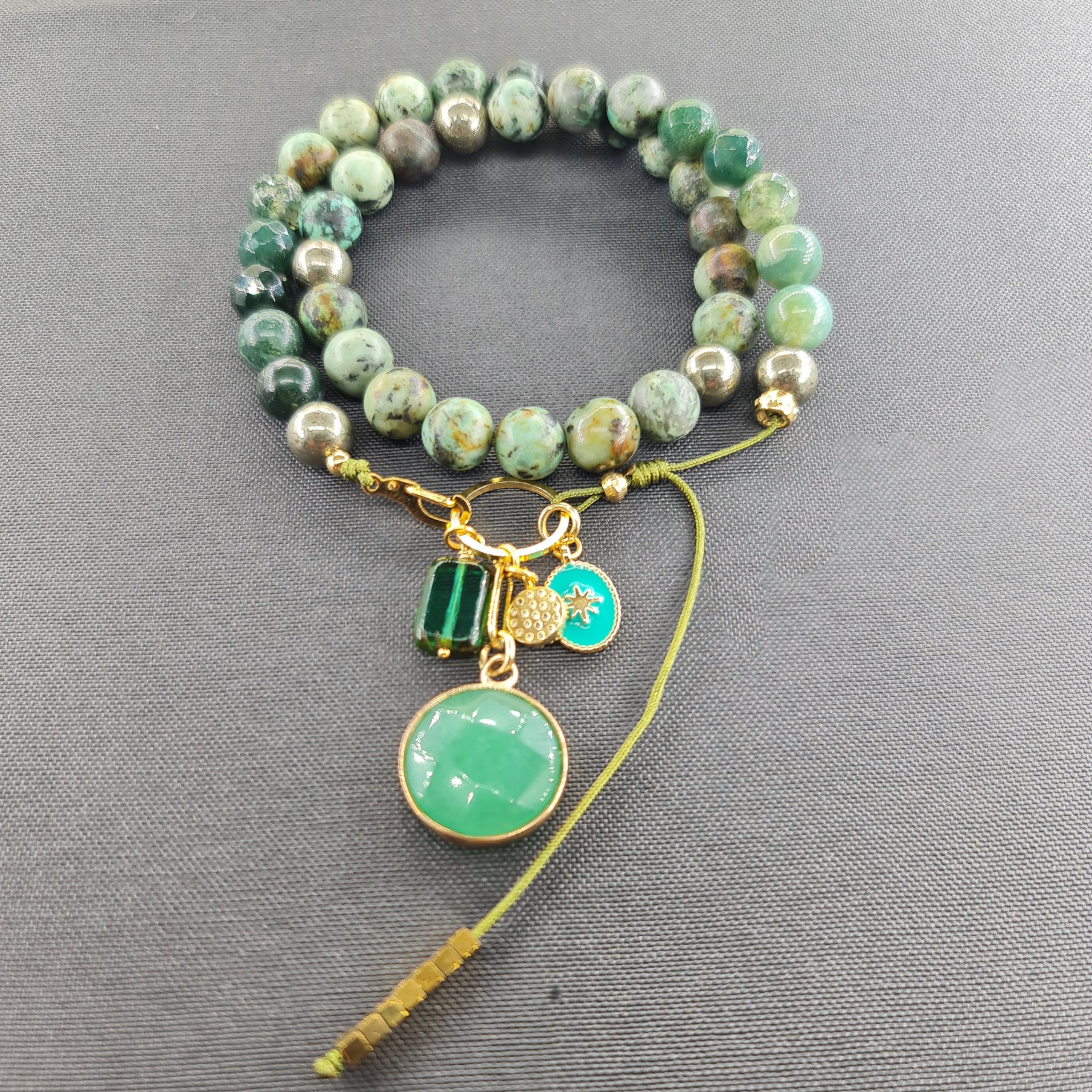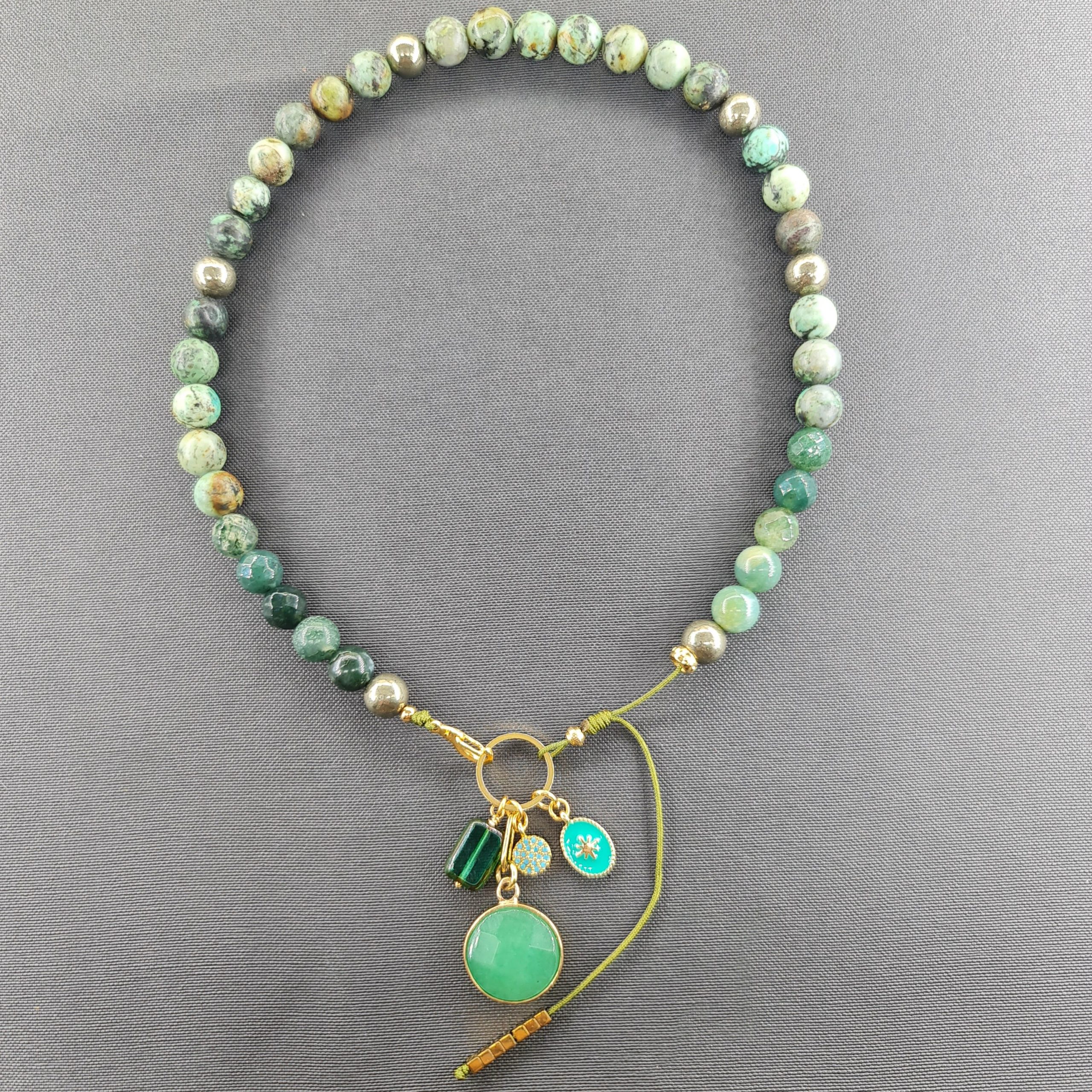 Collier en perles de turquoise africaine. Diamètre des perles 0,8 mm. Les breloques gri-gri sont en acier inoxydable, son pendentif est en pierre naturelle d’aventurine. Il se porte également en bracelet.