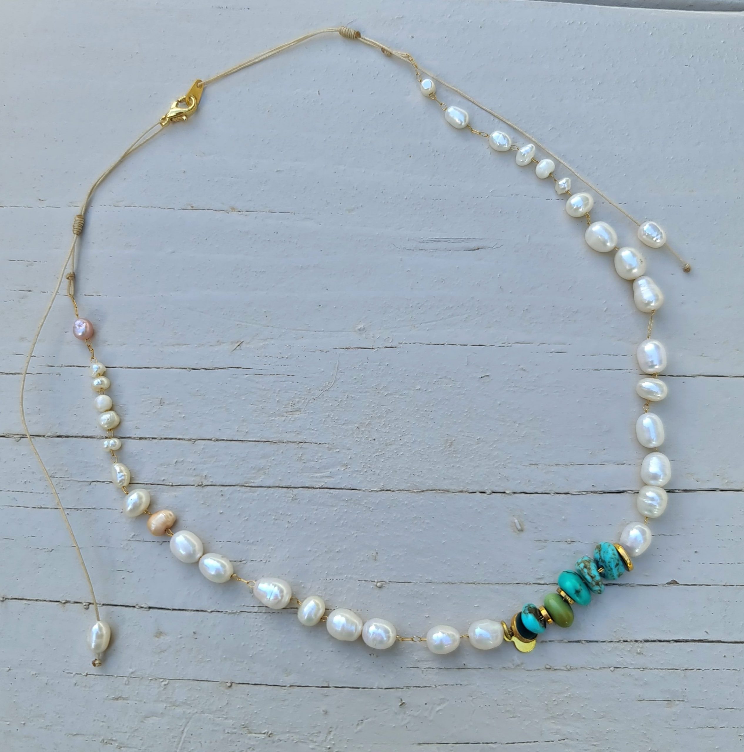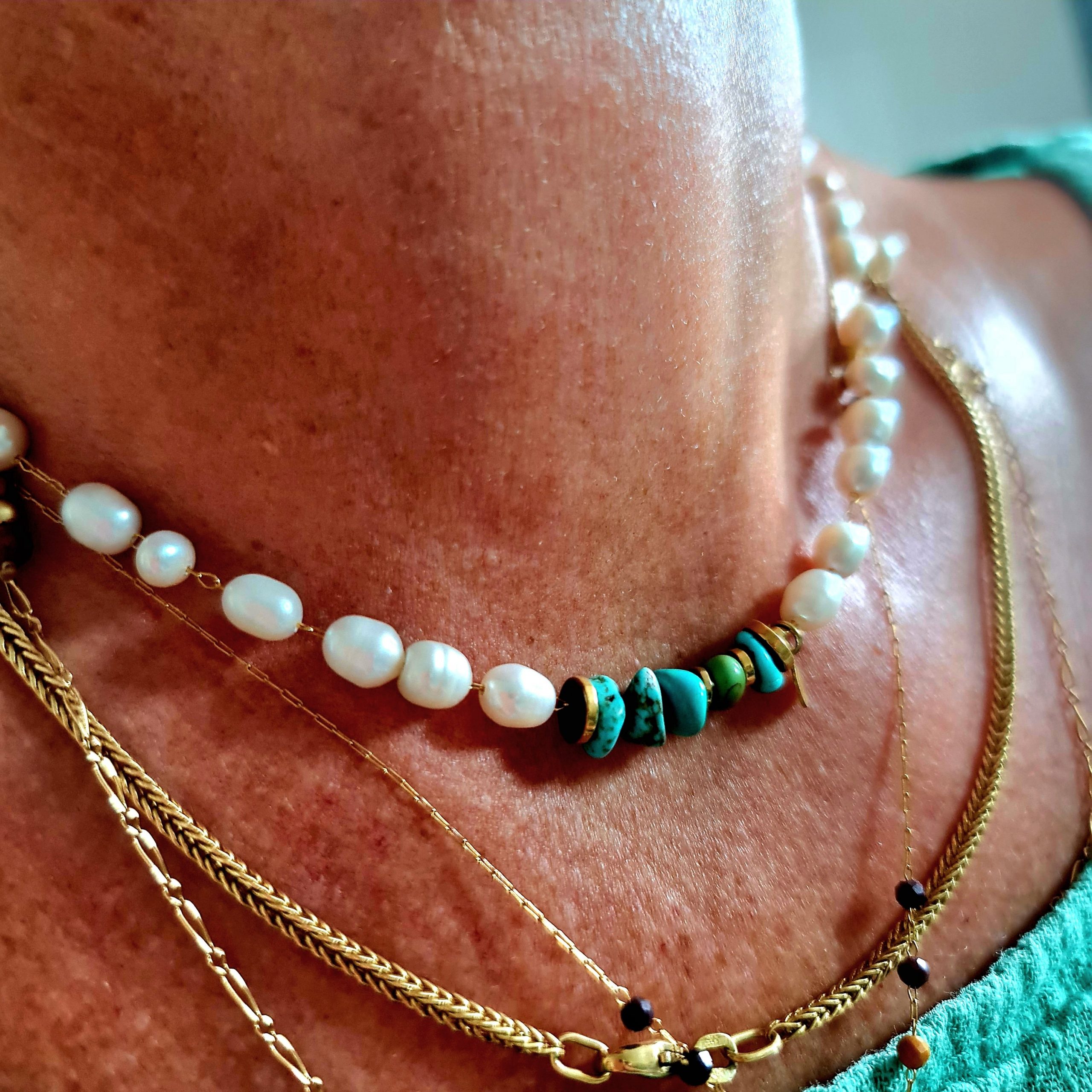Collier perles de culture montées sur chaîne fine en acier doré inoxydable. Fermeture réglable.
