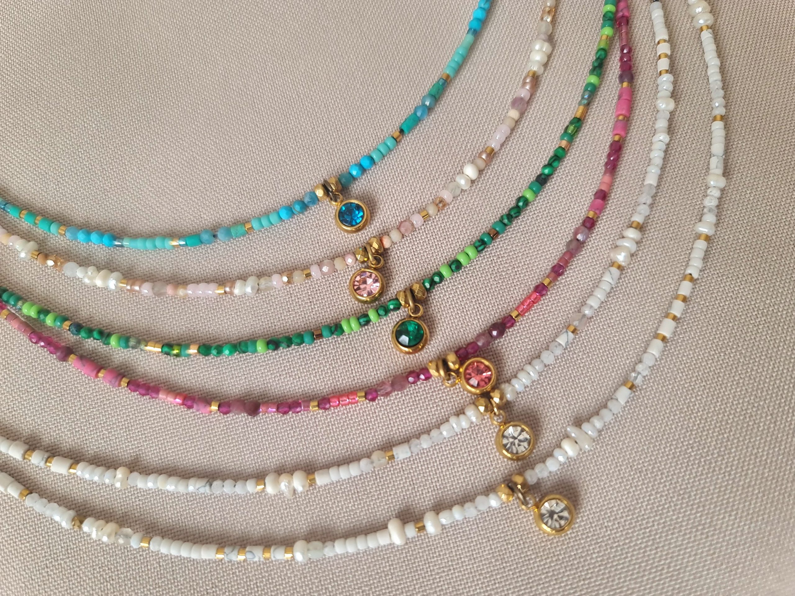 Collier de perles semi-précieuses montées sur câble. Fermeture réglable. Résistant à l’eau.
