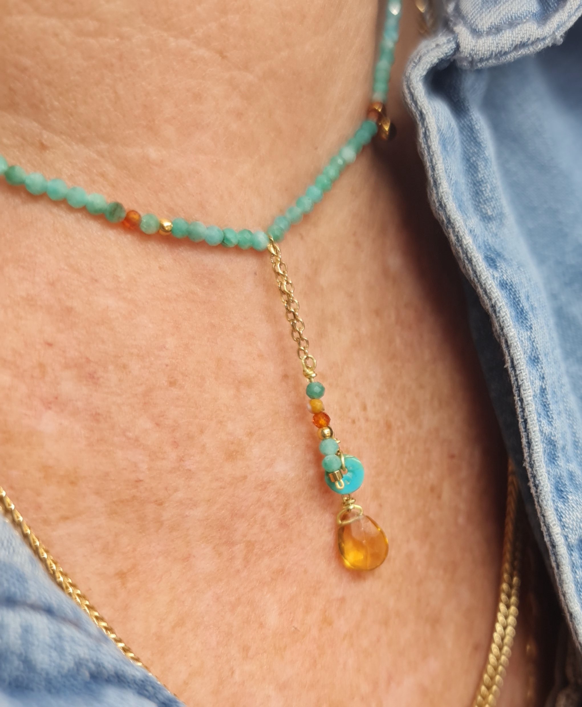 Un équilibre subtil entre simplicité, finesse et esprit bohème. 2 couleurs proposées bleu (Amazonite) et kaki ( obsidienne)