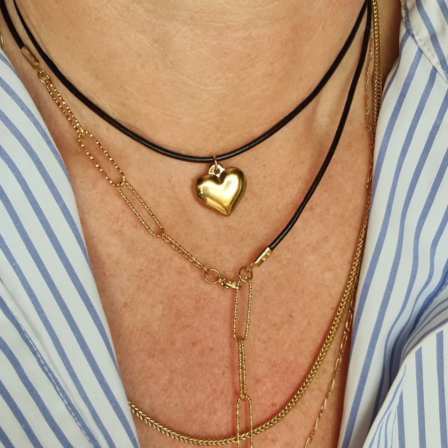 Collier Love « My valentine » Composé de lanière en cuir véritable, les finitions sont en chaînes acier doré inoxydable ainsi que le pendentif cœur qui est semi plein et bombé de chaque côté. Produit testé, résistant à l’eau.