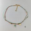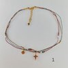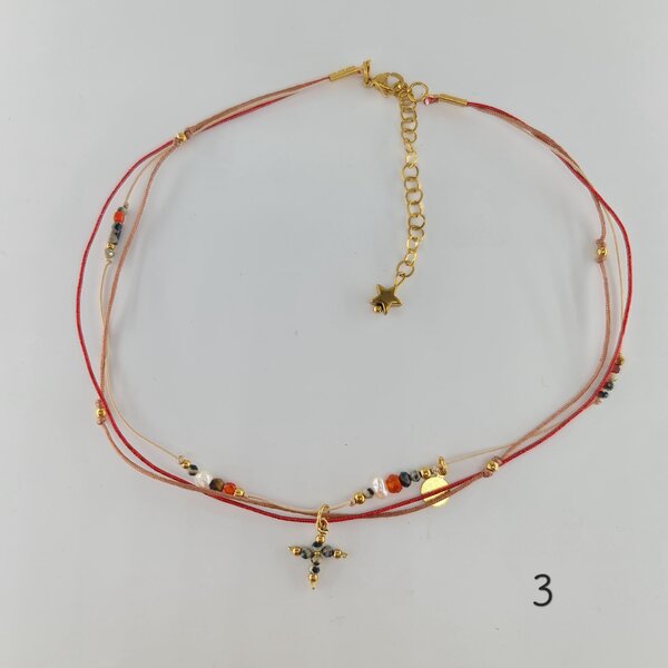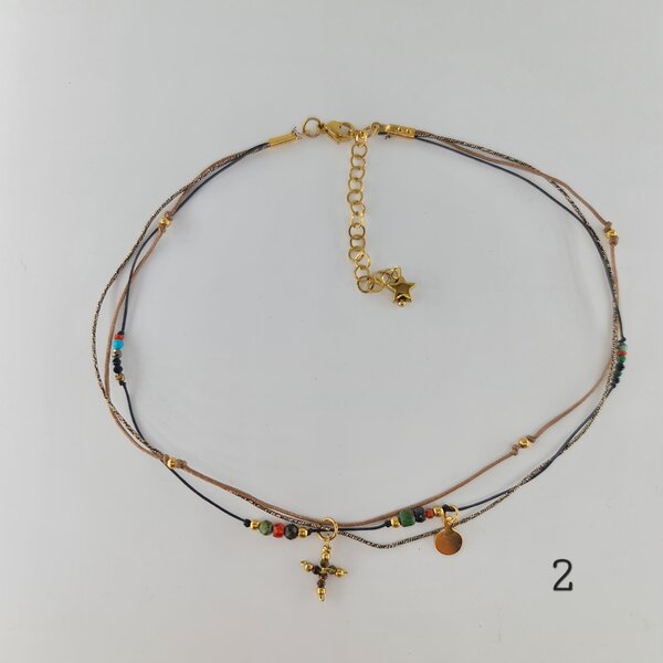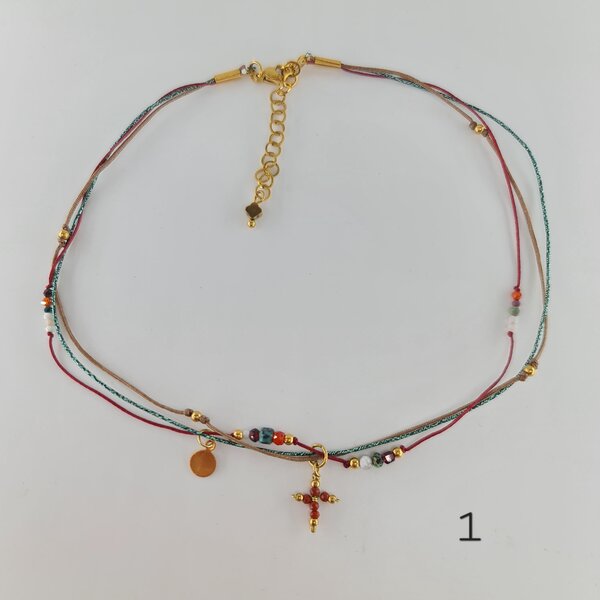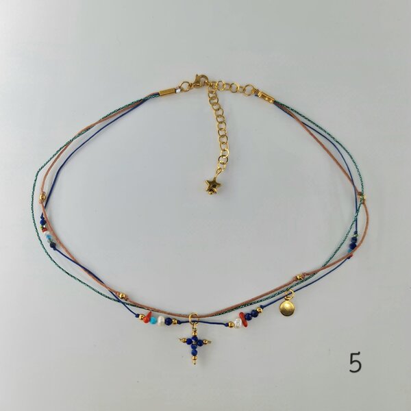 Ce collier raffiné se compose de plusieurs fils colorés ornés de perles semi-précieuses (lapis-lazuli, corail, jaspe dalmatien, jaspe rouge, aventurine…) et de petites perles dorées. En son centre, une croix délicate en perles semi-précieuses apporte une touche symbolique et élégante.