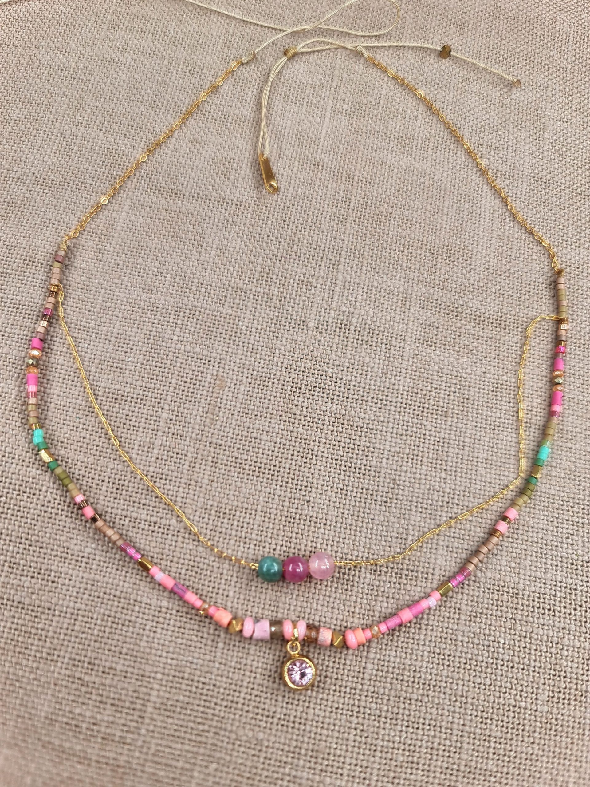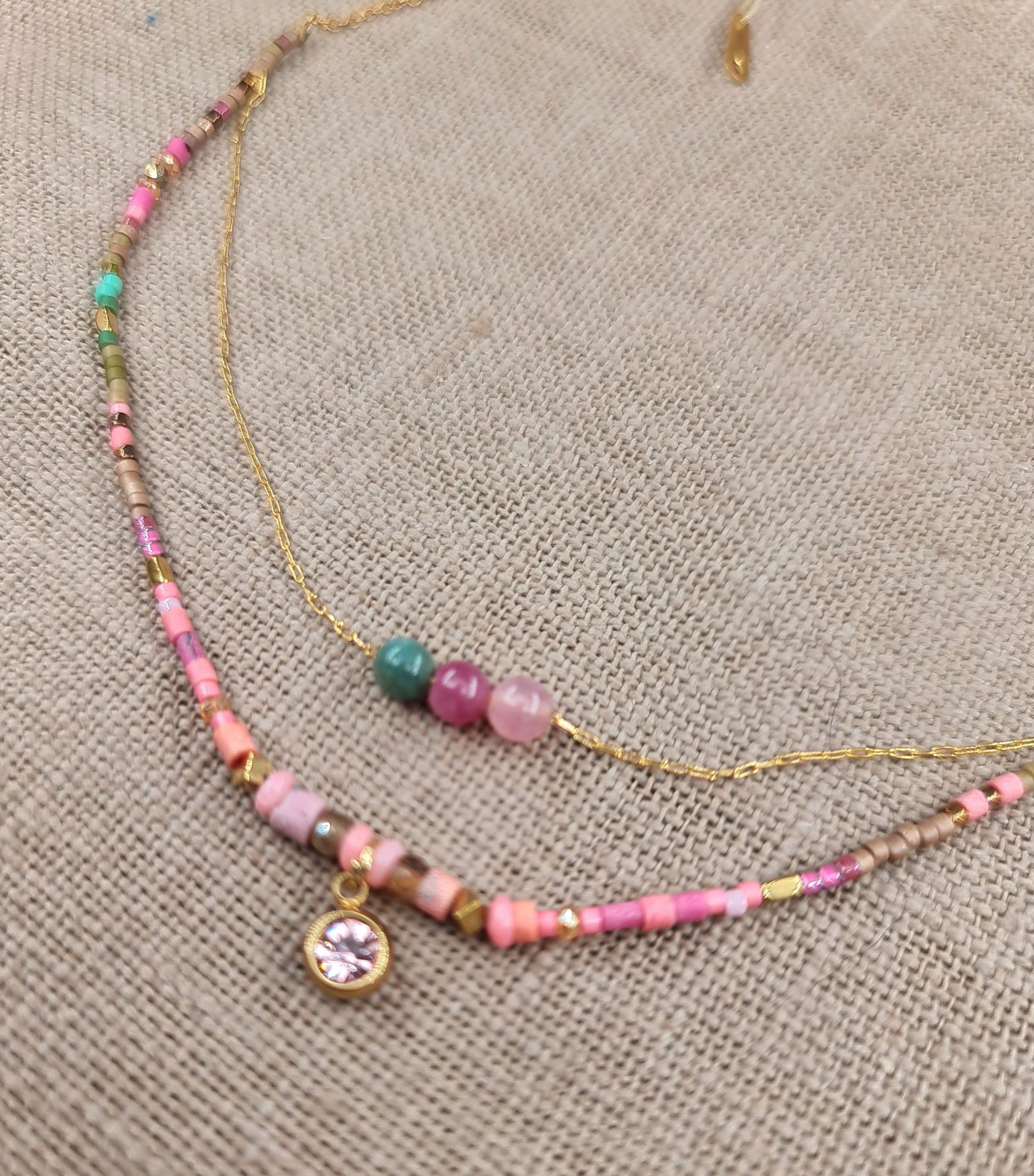 Jolie collier double « Ros » Composé de perles semi-précieuses, orné d’un pendentif Zirconium rose. La chaîne est en acier doré inoxydable. Sa fermeture est réglable.