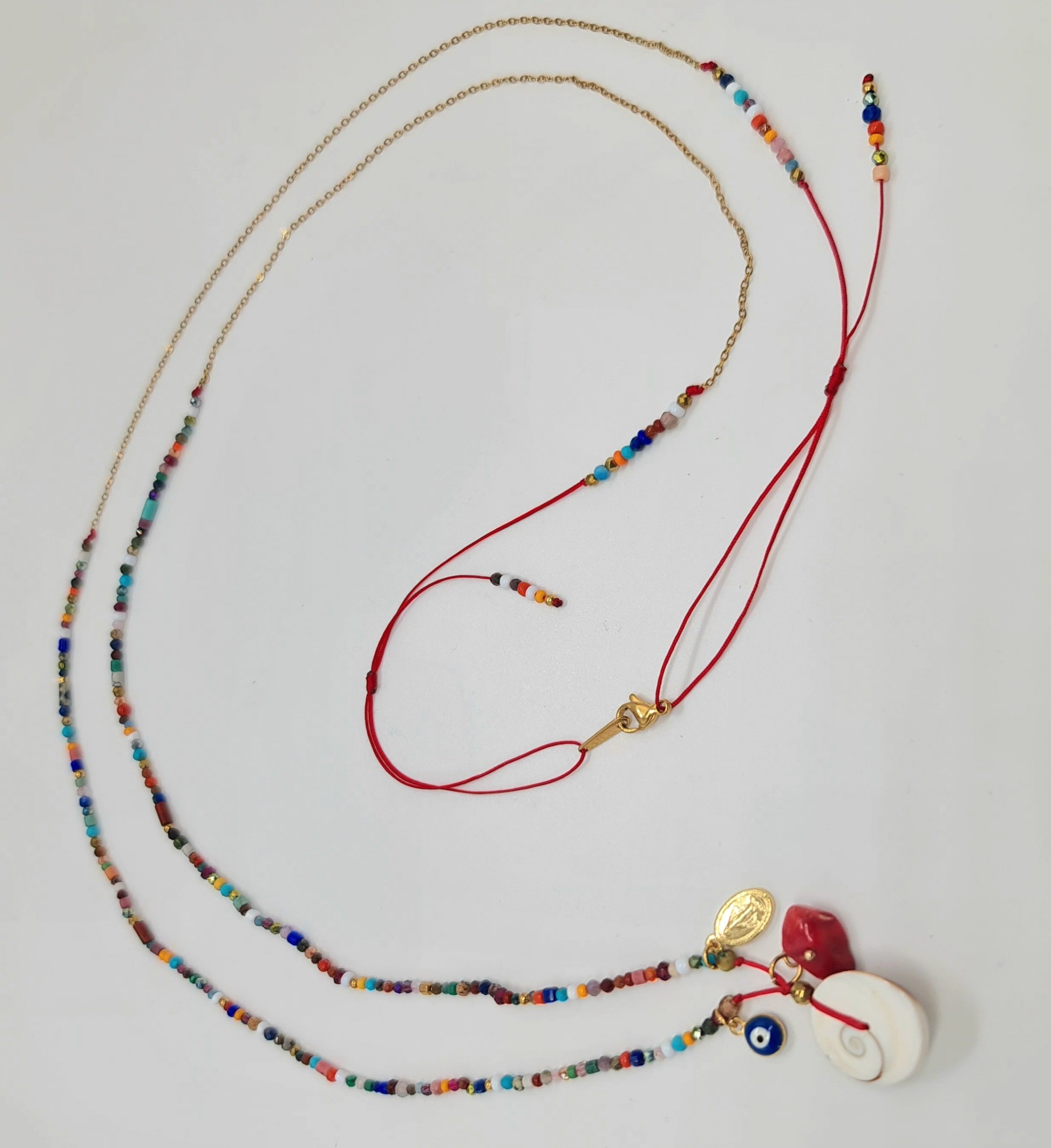 Confectionné à la main, il associe des perles semi-précieuses multicolores, un coquillage naturel de Sainte-Lucie, un pendentif Madone plaqué or, l’œil et une petite branche de corail ainsi qu’une chaîne en acier inoxydable doré. Sa fermeture coulissante vous permet d’ajuster la longueur selon vos envies. Résistant à l’eau.