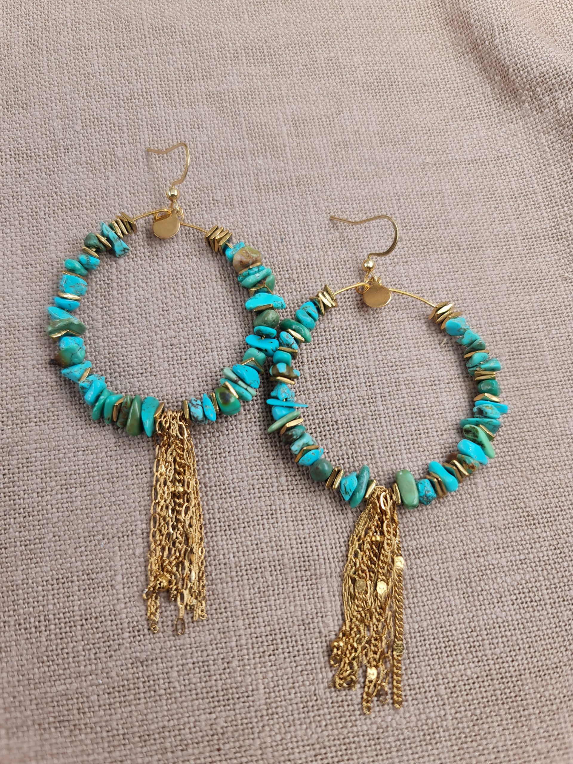 Boucles d’oreilles créoles composées de turquoise véritable, métal acier.